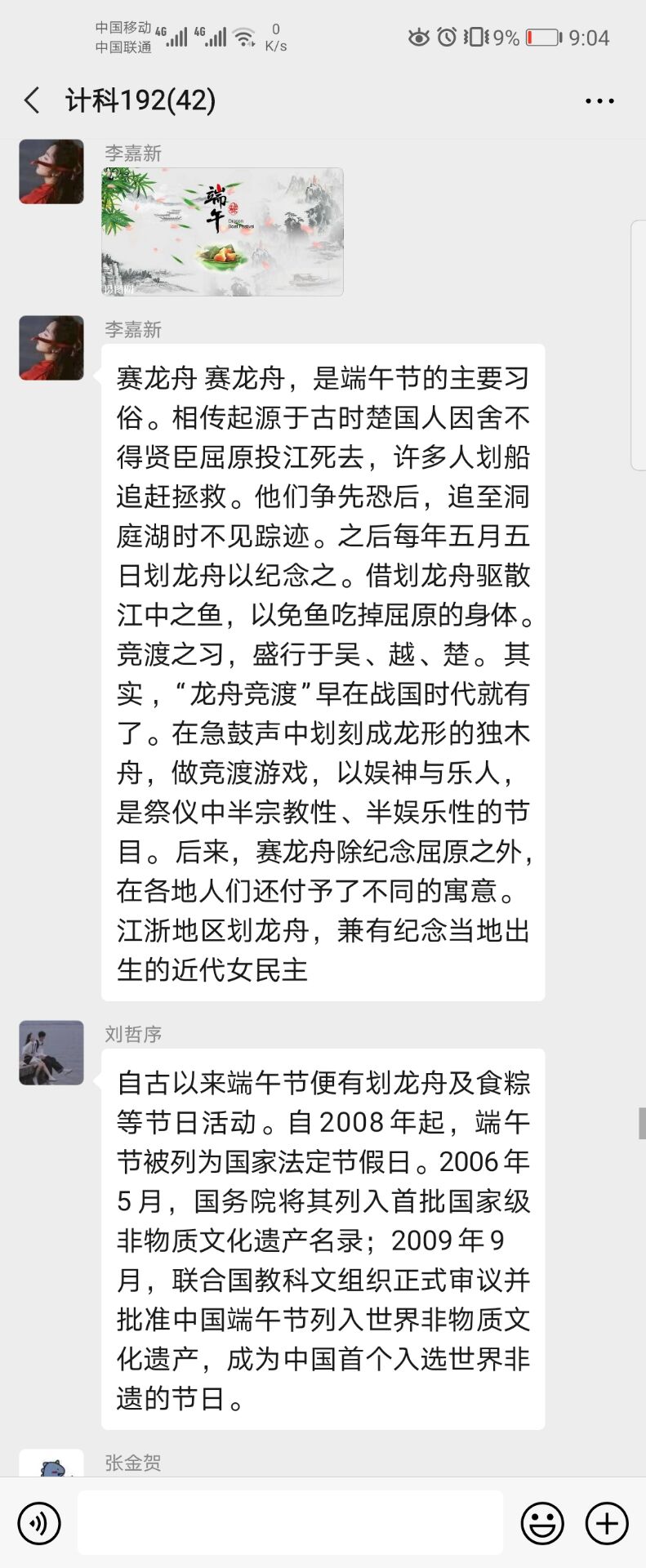 2020年6月25日,计科192班于微信平台开展“端午节”主题团活,此次团活由组织委员李嘉新主持,计科192班全体学生共同参与。