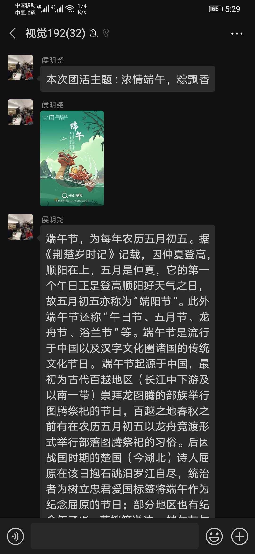 为了让同学们弘扬中华民族传统节日,感受传统佳节端午的节日氛围。视觉192班于2020年6月25日在班级微信群里开展了端午节,共中国情的主题团活。