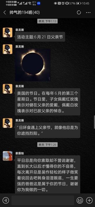 袁龙瀚同学表示:“父亲节,最广泛的日期在每年6月的第三个星期日,世界上有52个国家和地区是在这一天过父亲节。节日里有各种的庆祝方式,大部分都与赠送礼物、家族聚餐或活动有关。父亲节遇上日环食,就像父亲总是为我们遮挡烈阳。”