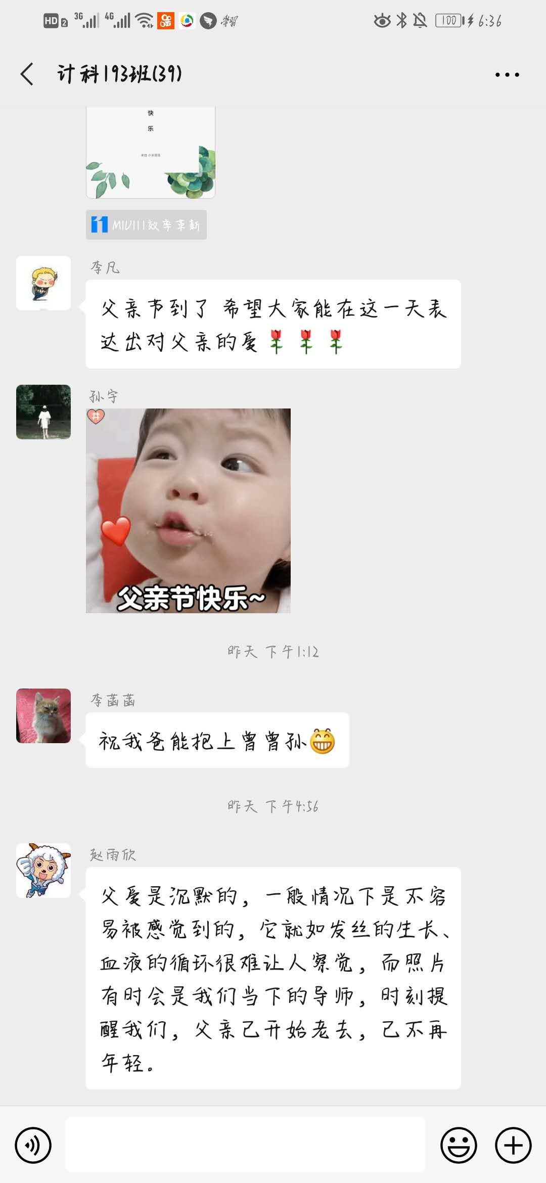 2020年6月21日,计科193班开展“父亲节”主题班会,此次班会由组织委员李凡主持其他同学参加。