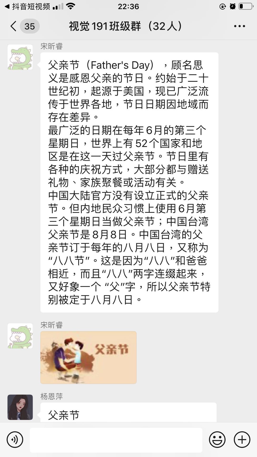 活动开始,宋昕睿同学首先向大家介绍了父亲节的由来、含义以及不同时代的不同形式,她说:“父亲节,是感恩父亲的节日,世界上有52个国家在这一天过父亲节。我们要在这一天分享大家怎样为自己的父亲过父亲节的,并且怎么表达费父亲的爱。”随后她组织大家在群里分享自己对父亲节的看法以及怎样给父亲过父亲节。