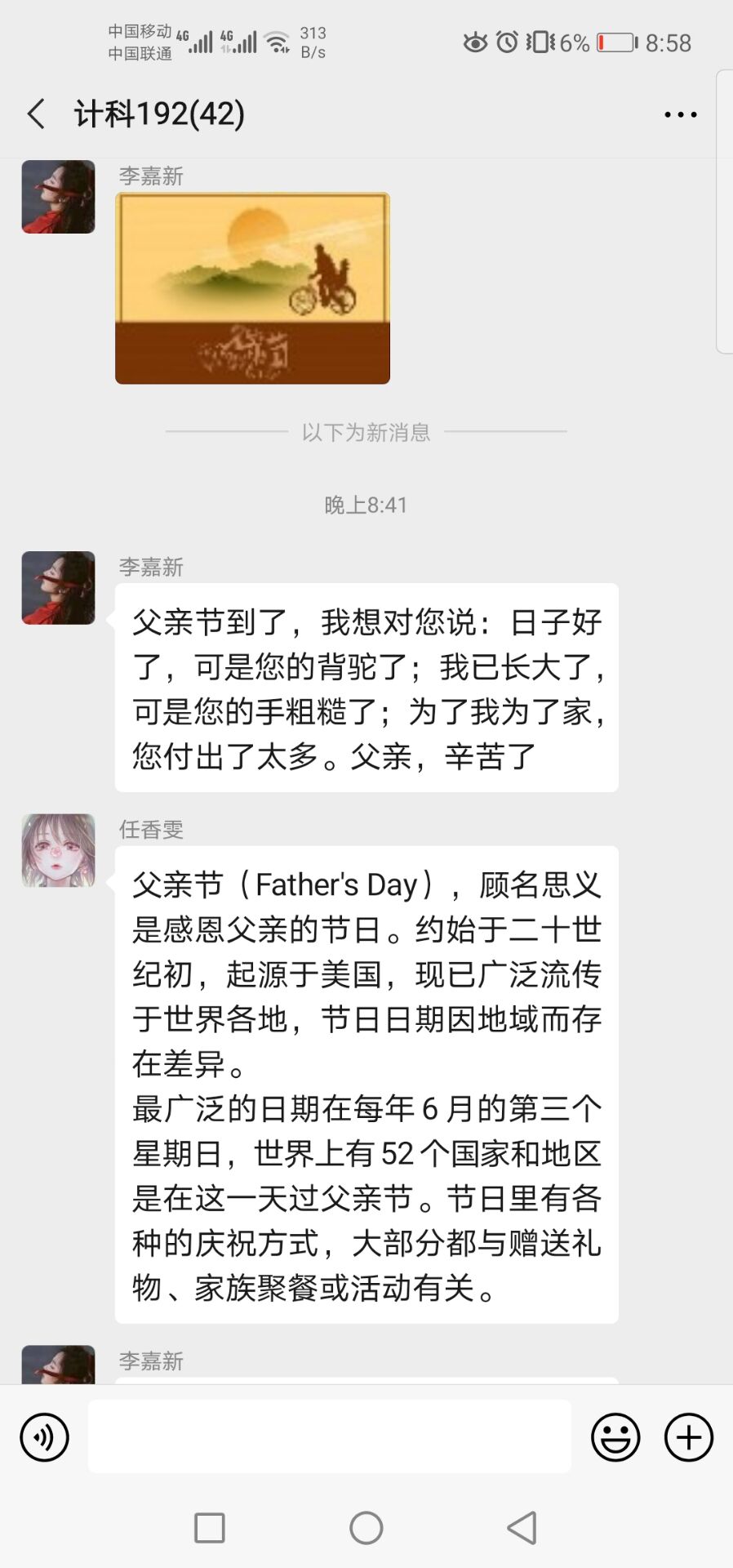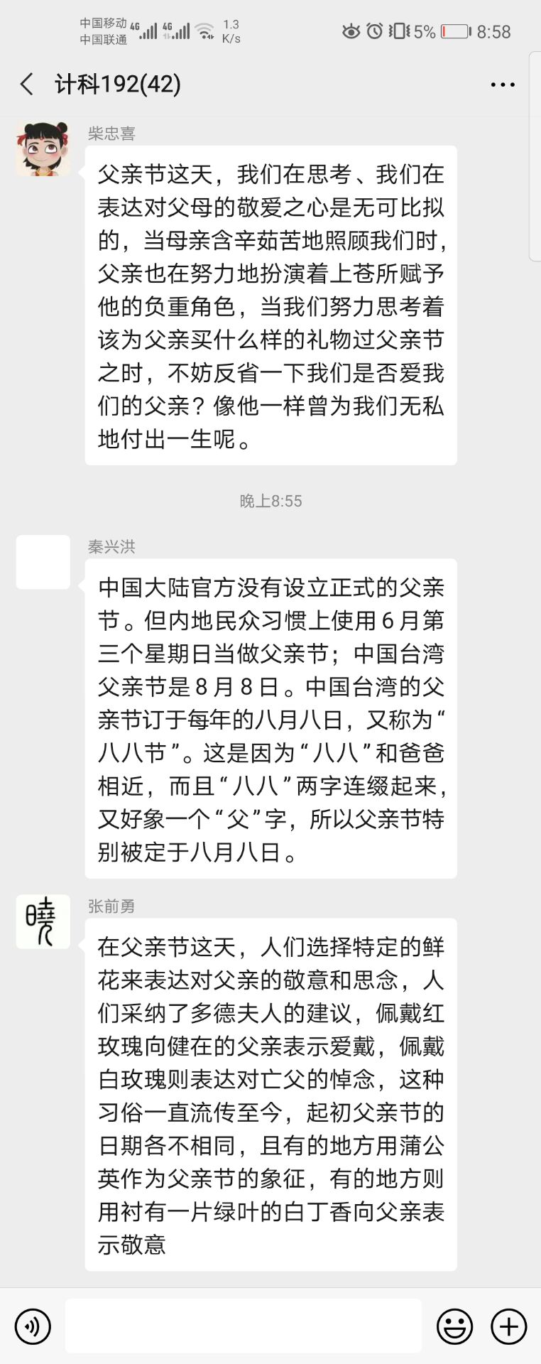 2020年6月21日,计科192班于微信平台开展“父亲节”主题团活,此次团活由组织委员李嘉新主持,计科192班全体学生共同参与。
