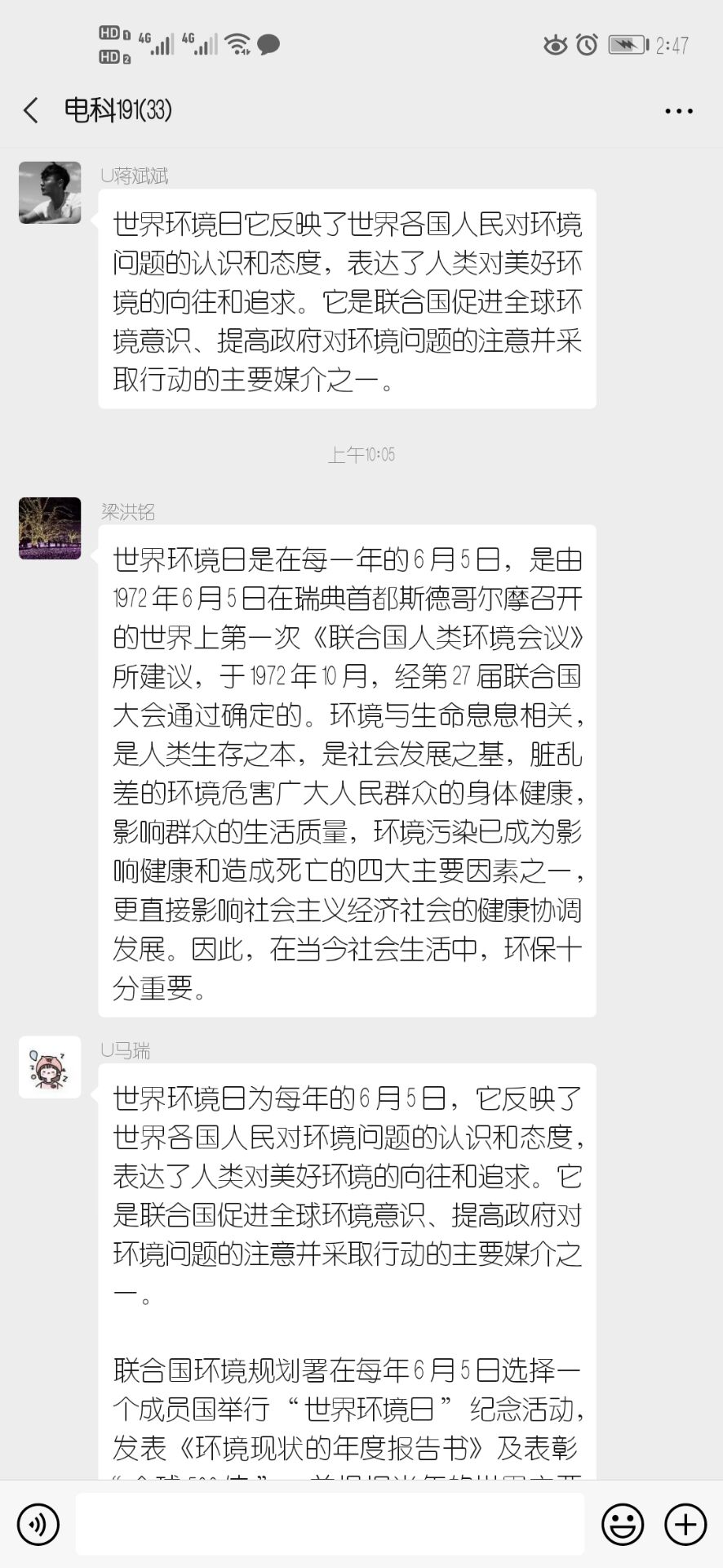 为让同学们知晓保护环境的重要性,关注我们赖以生存的生态系统。2020年6月5日,电科191班通过班级微信群开展“世界环境日”线上主题团活,本次团活由组织委员康佳慧主持,电科191班全体成员参加。