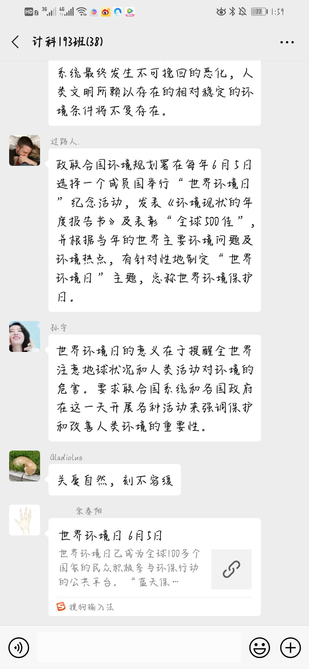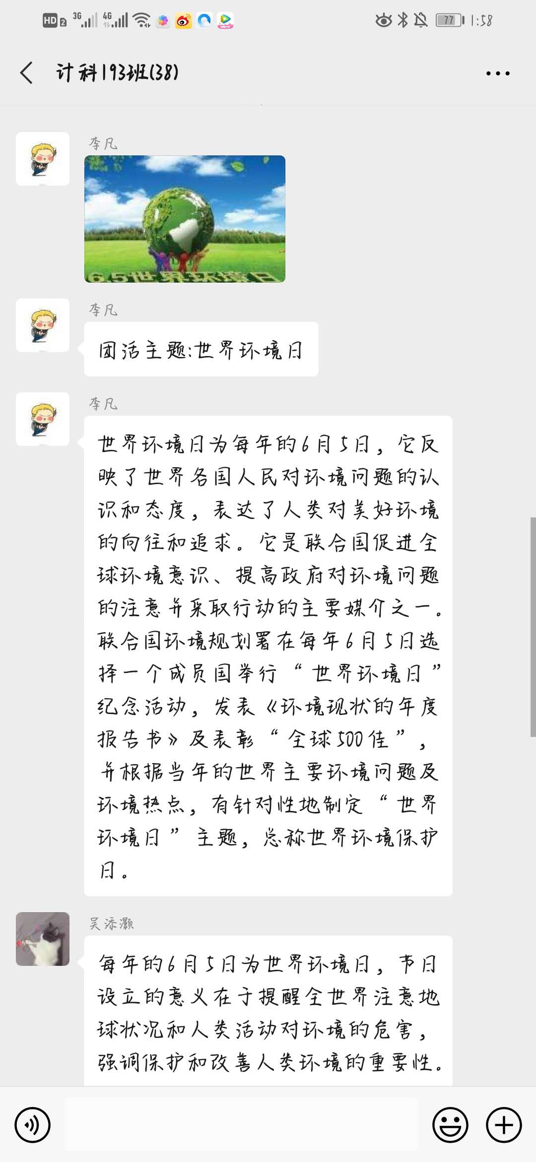 2020年6月5日,计科193班开展“世界环境日”主题班会,此次班会由组织委员李凡主持其他同学参加。