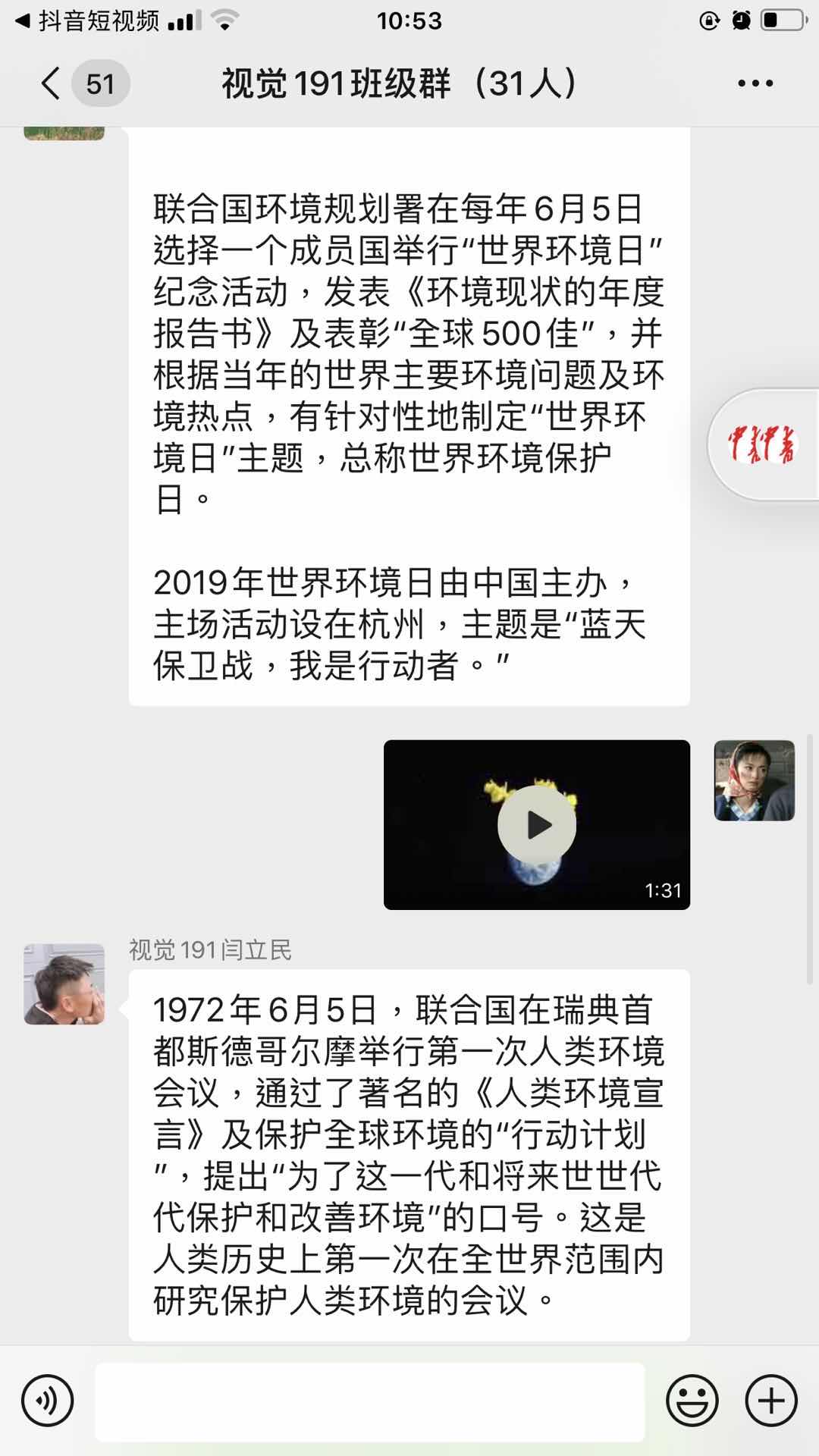 2020年6月5日,视觉191班在组织委员孙慧慧的组织下于线上班级群开展“世界环境日”主题团活。此次活动由孙慧慧主持,视觉191班全体同学参加。