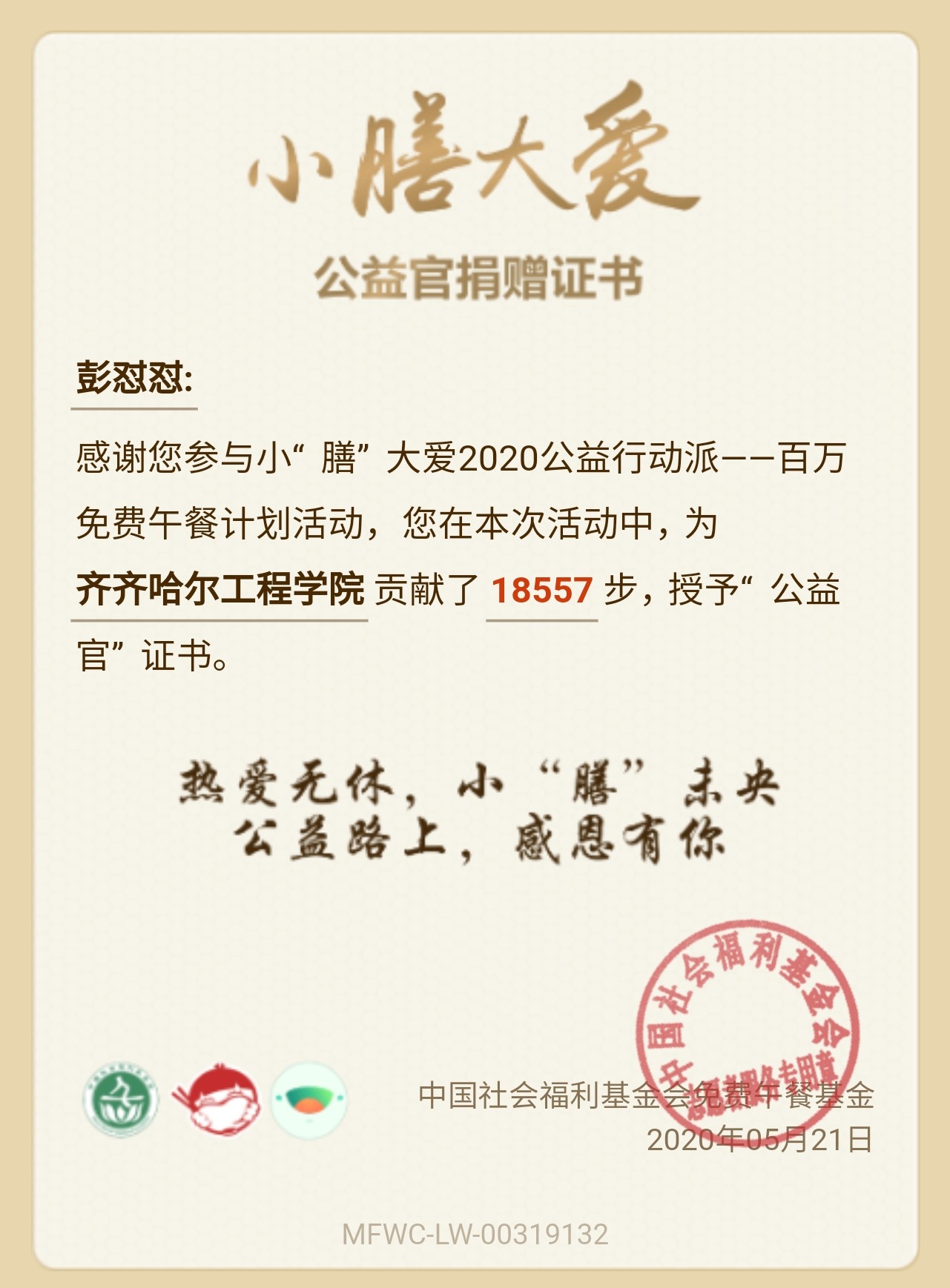 2020年5月23日-5月25日期间,求索文学社联合慈善社团举办“小膳大爱”公益捐赠活动,本次活动是由中国社会福利基金会免费午餐基金联合京东数科旗下梨涡发起的公益活动。