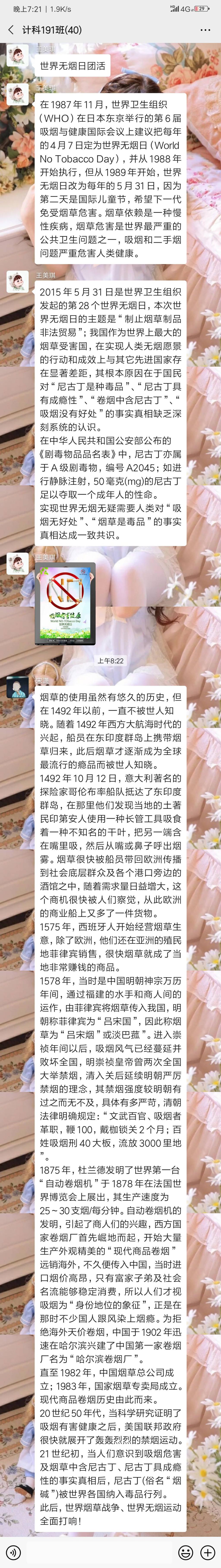 2020年5月31日计科191班由团支书王美琪组织召开世界无烟日主题线上团活,计科191班全员参加。
