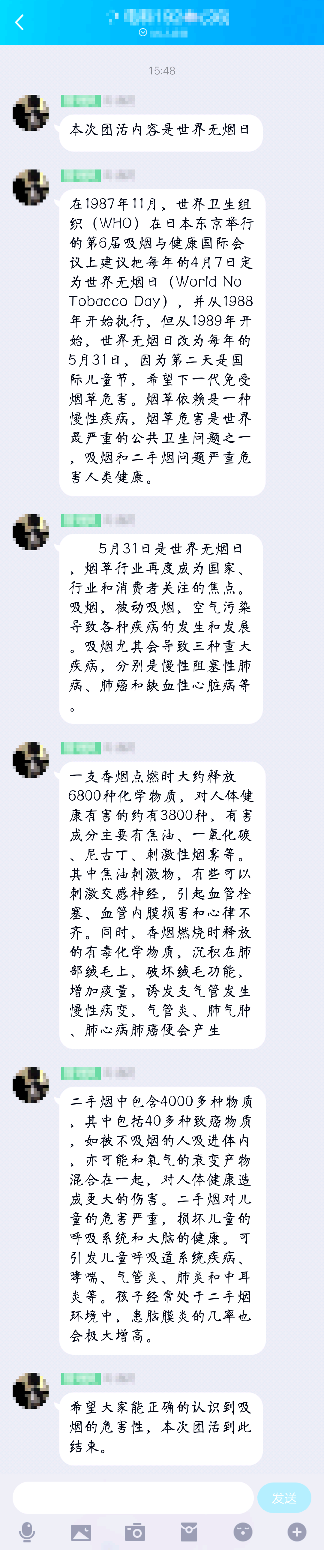为了让同学们了解香烟的危害和身体健康,电科192班于2020年5月31日在QQ群开展“世界无烟日”主题活动,此次活动由团支书周鑫蕊主持,电科192班全员参加。