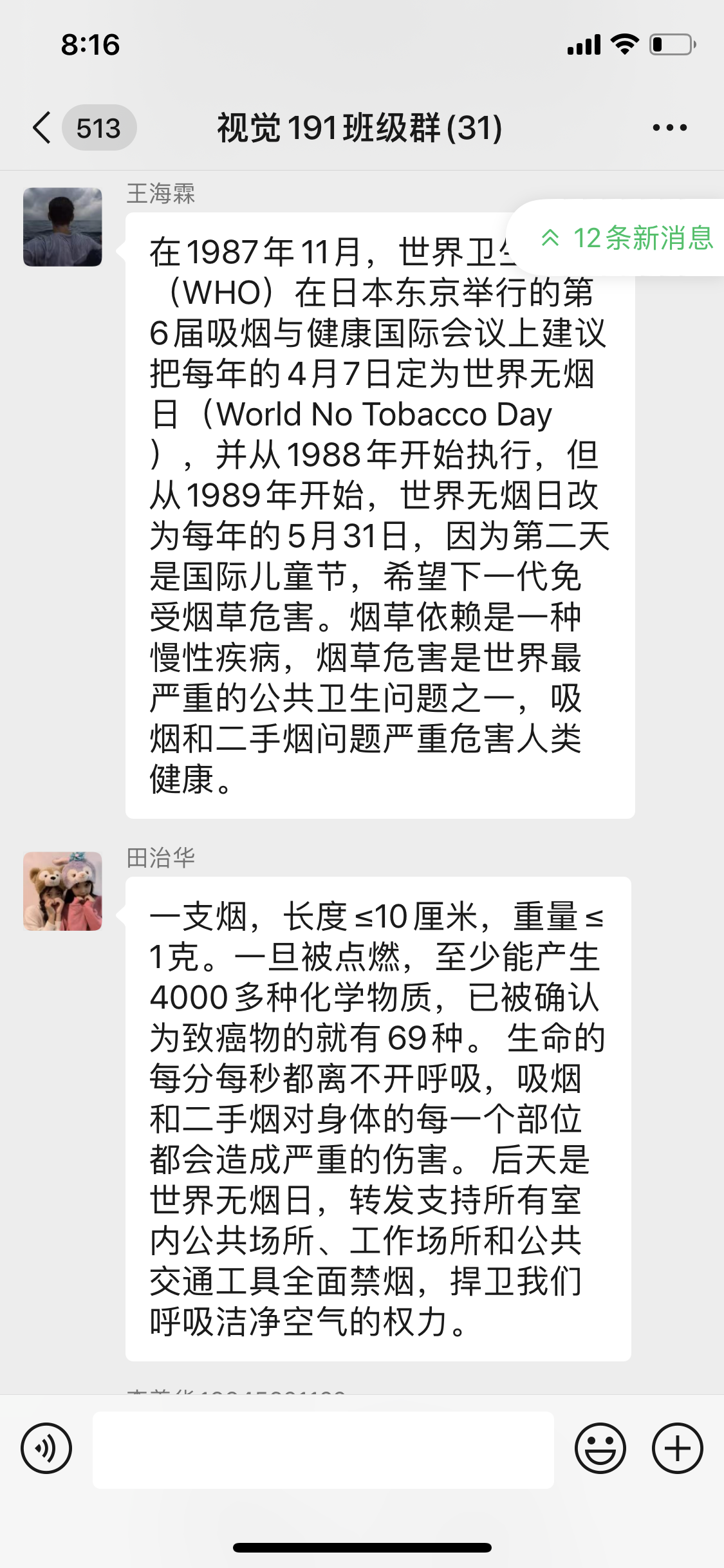 2020年5月31日,视觉191班在宣传委员闫立民的组织下于班级微信群开展线上“世界无烟日”主题团活。此次活动由闫立民主持,视觉191班全体同学参加。