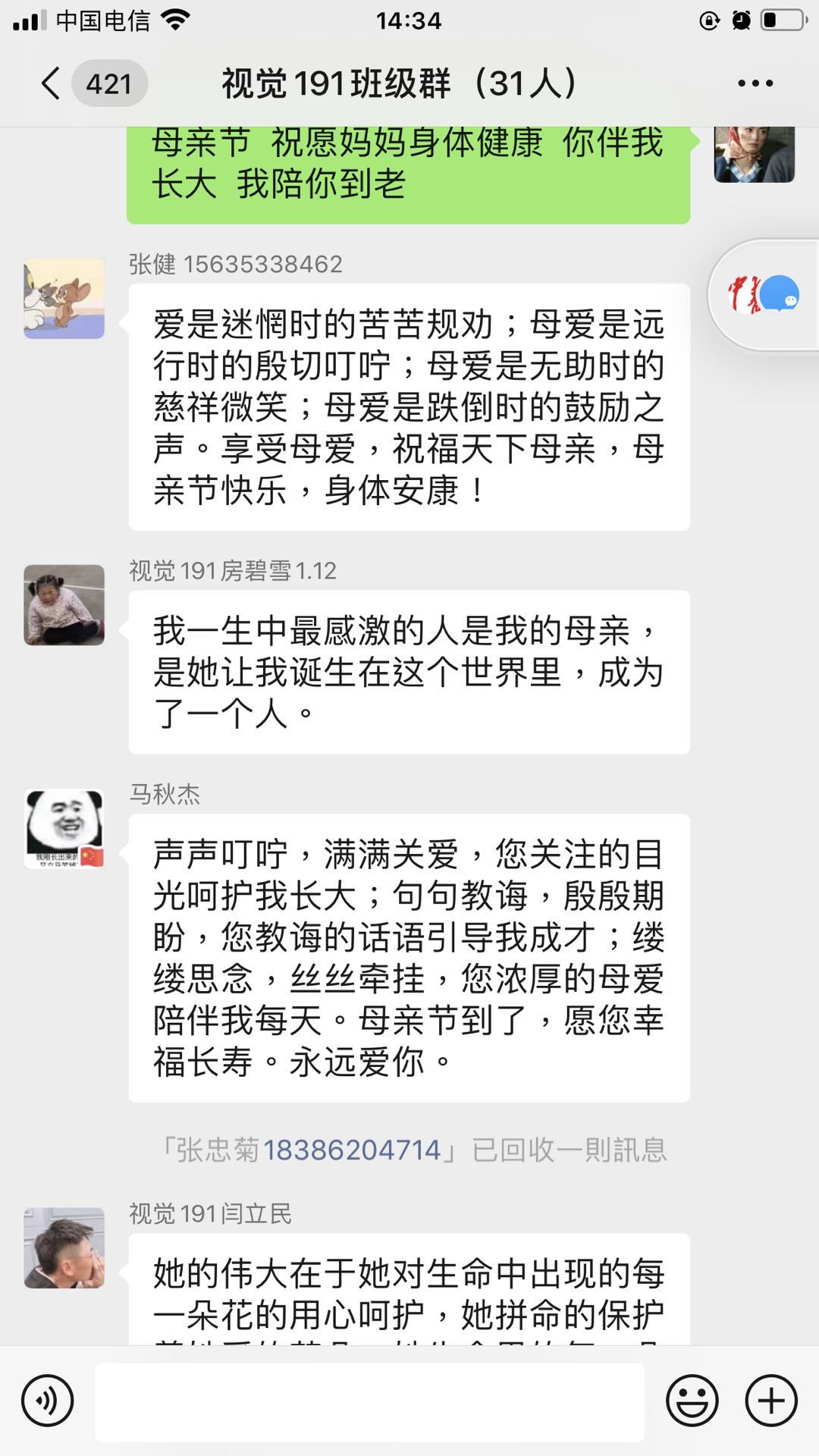 2020年5月9日,视觉191班在组织委员孙慧慧的组织下于班级微信群开展此次母亲节“感恩母亲”主题团活。此次活动由孙慧慧主持,视觉191班全体同学参加。
