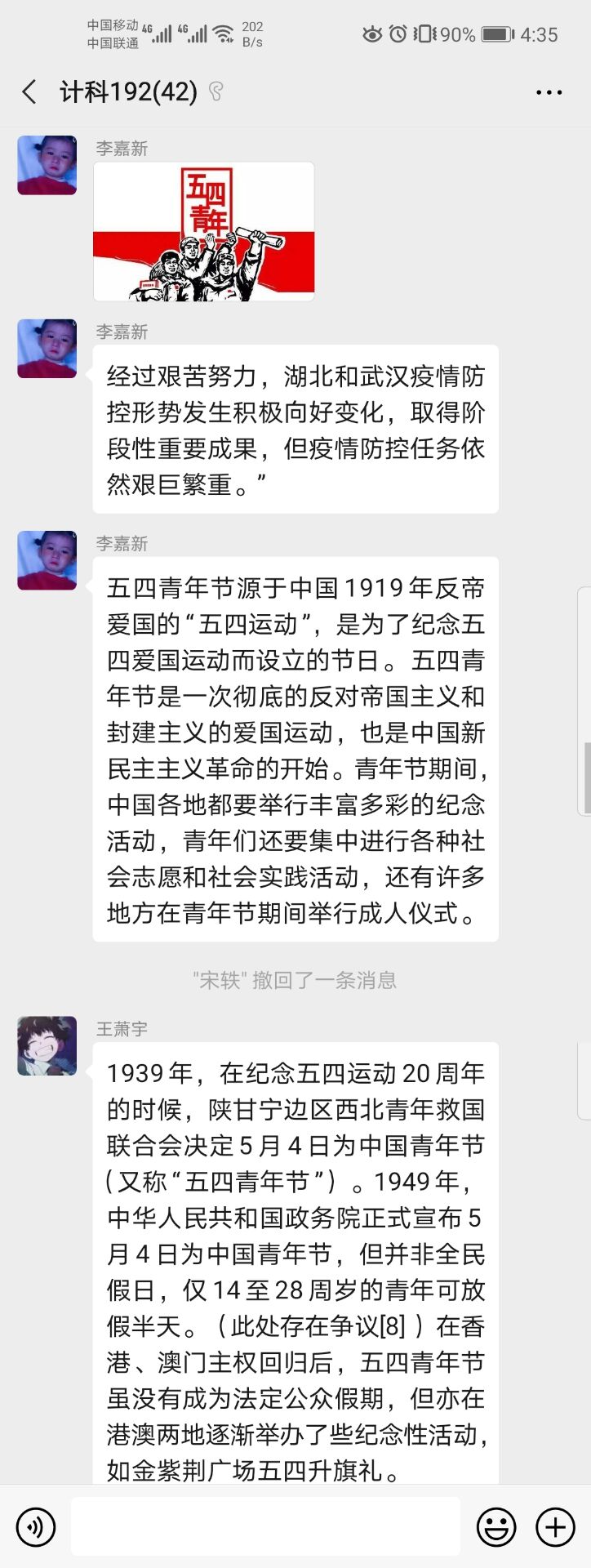 2020年5月4日,计科192班全体同学于微信平台开展“五四青年节”主题团活,计科192班组织委员李嘉新主持,计科192班全体同学共同参与。