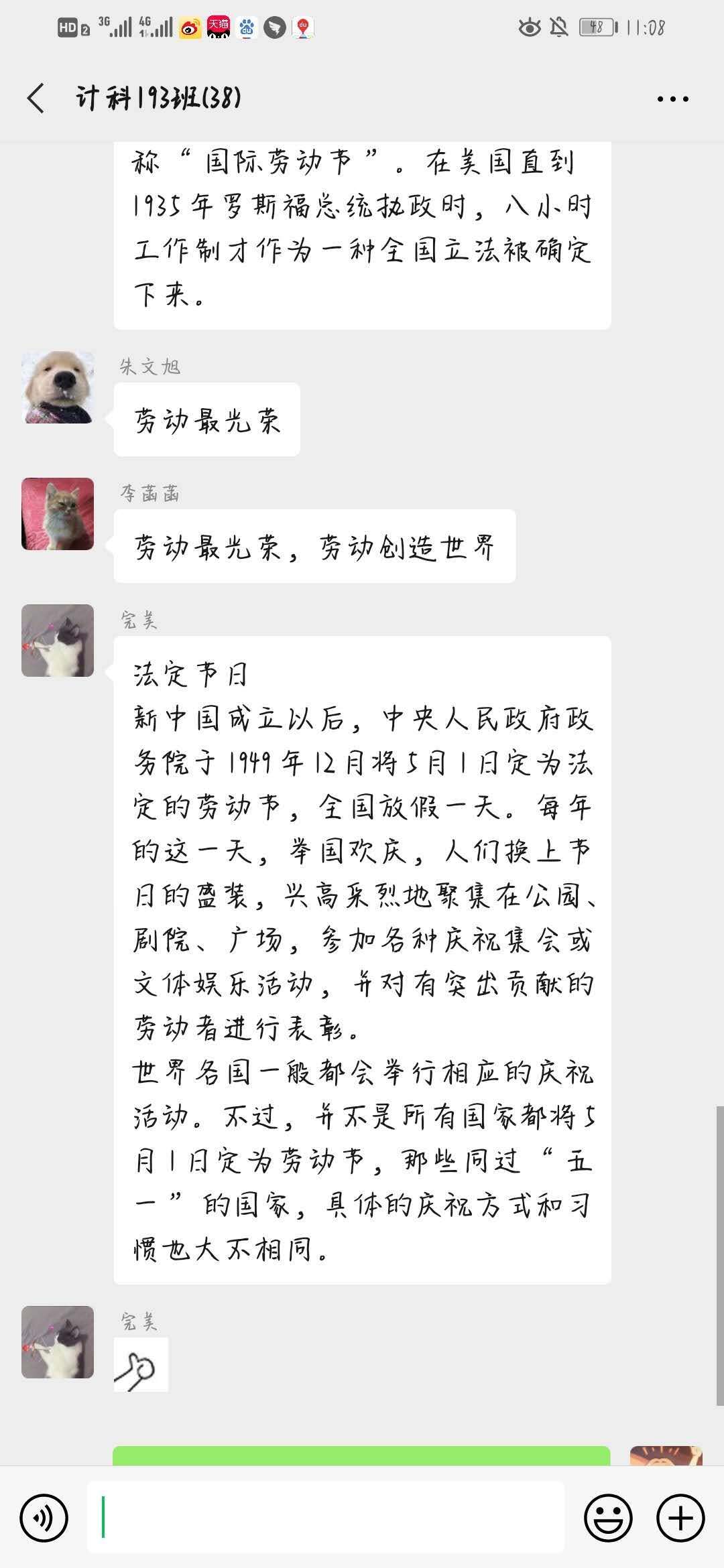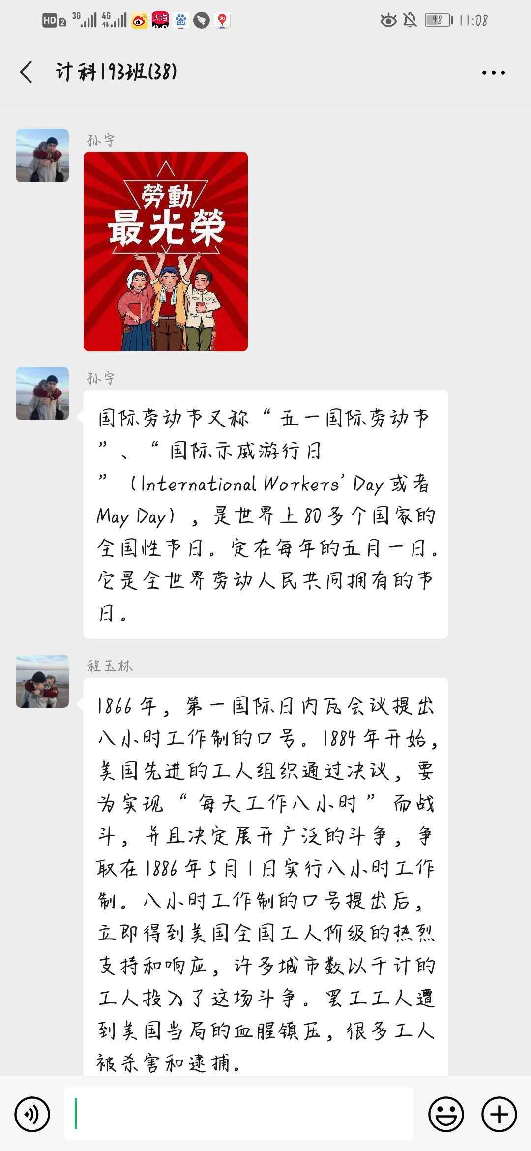 2020年5月1日,计科193班开展“五一劳动节”主题班会,此次班会由团支书孙宇主持,其他同学参加。