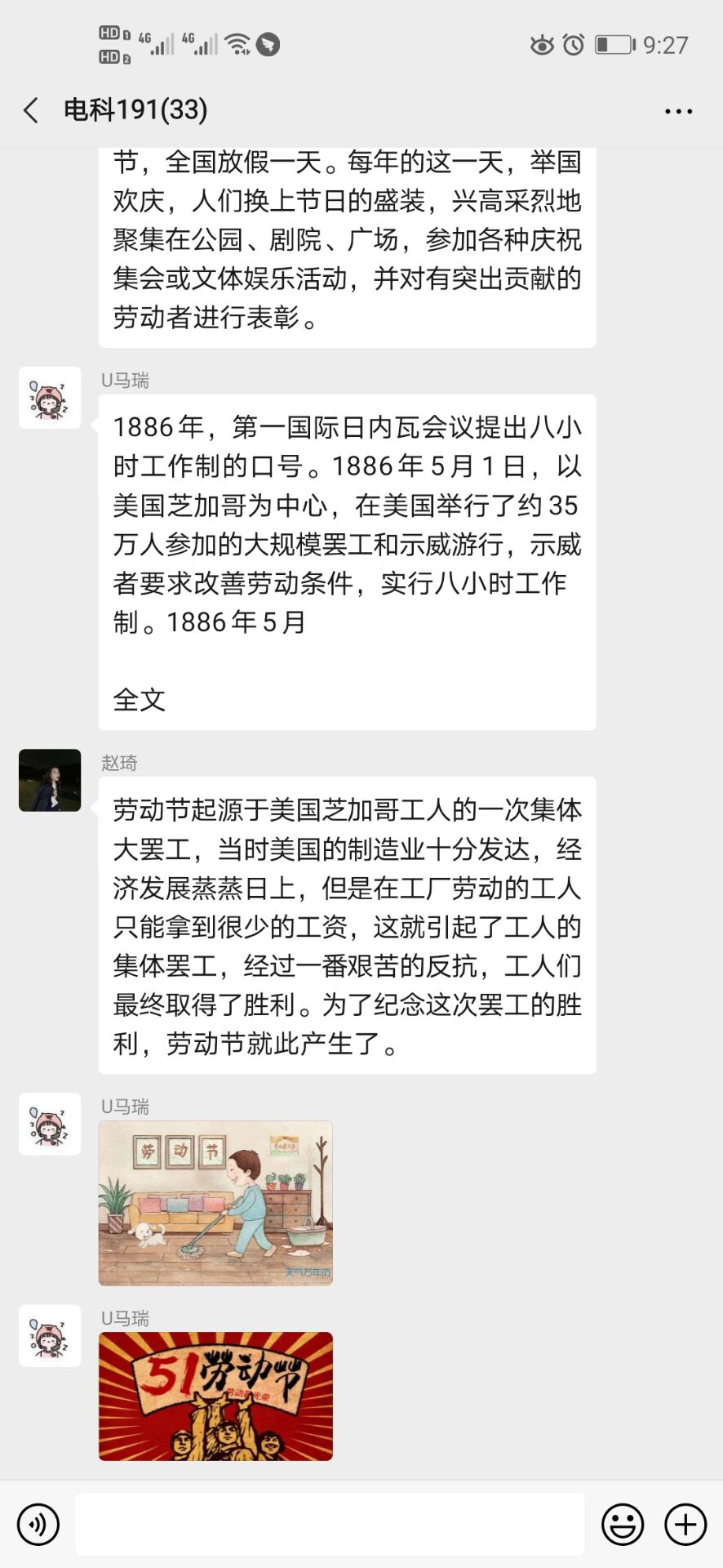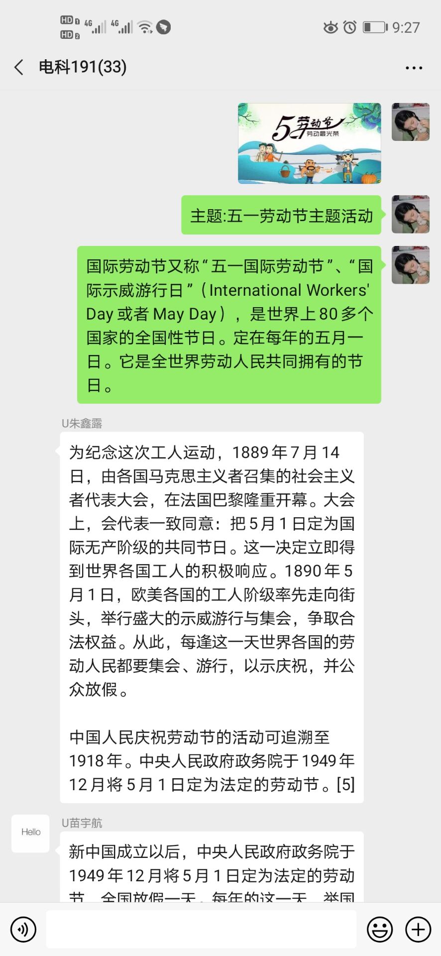 2020年4月30日,电科191班通过班级微信群开展了“五一国际劳动节”主题团活,本次活动由组织委员康佳慧主持,电科191班全体同学参加。