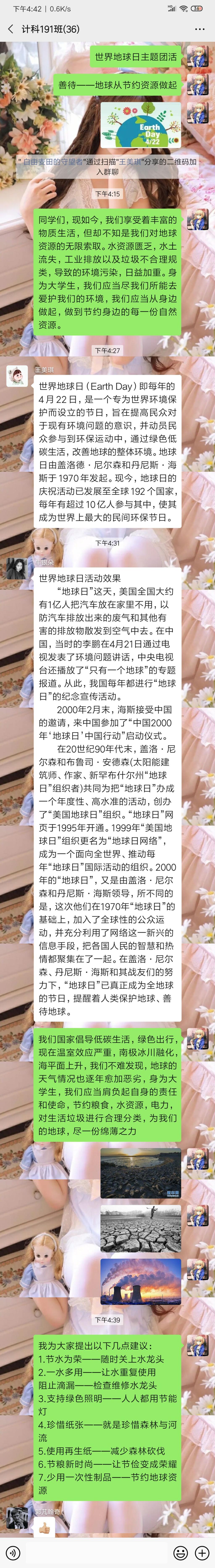 2020年4月22日计科191班由组织委员张宏宇组织召开世界地球日主题线上团活,计科191班全员参加。