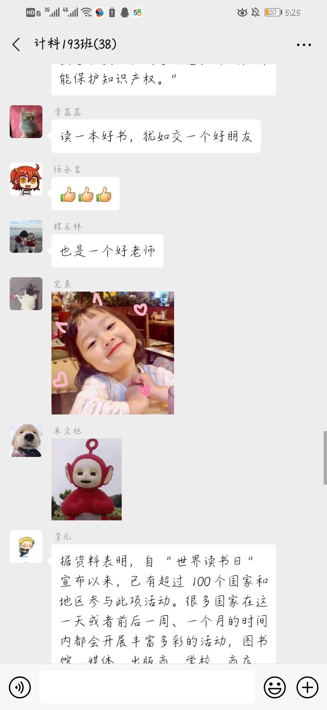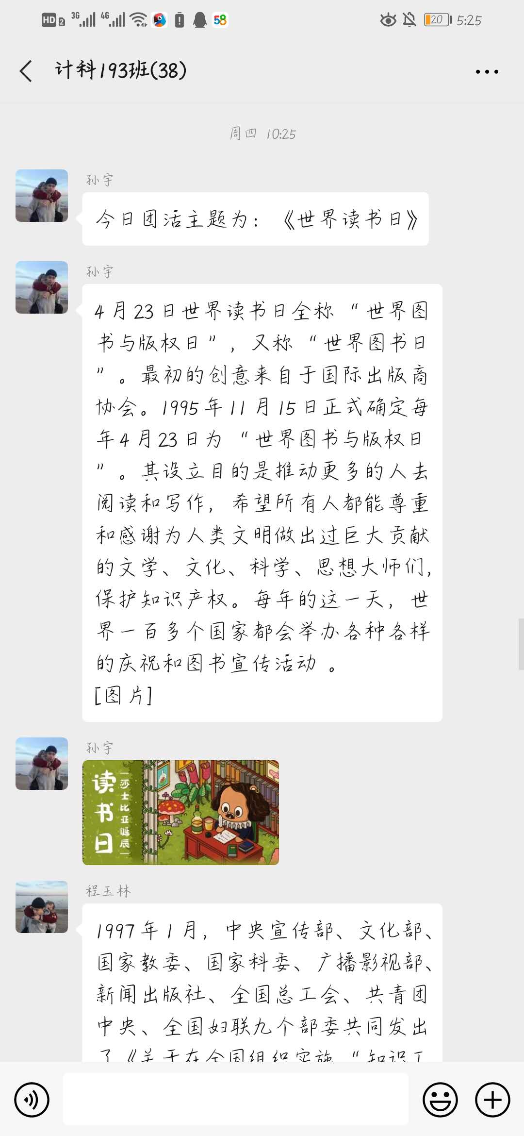 2020年4月23日,计科193班开展世界读书日主题班会,此次团活由团支书孙宇主持,其他同学参加。