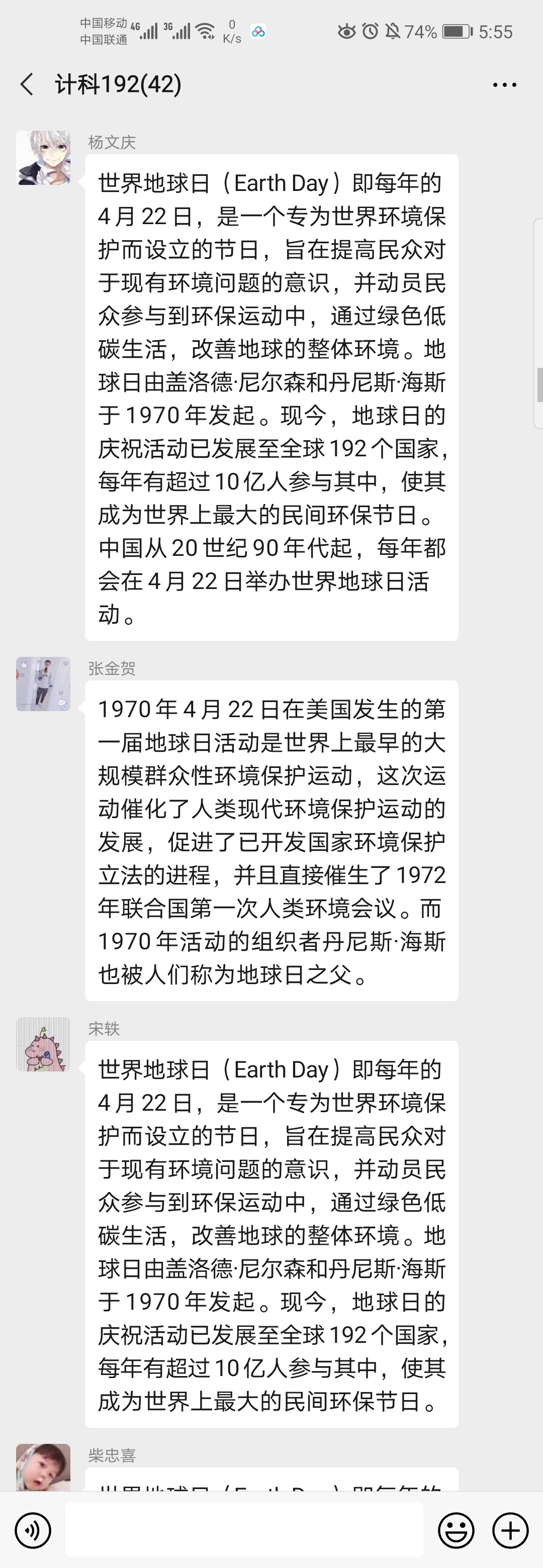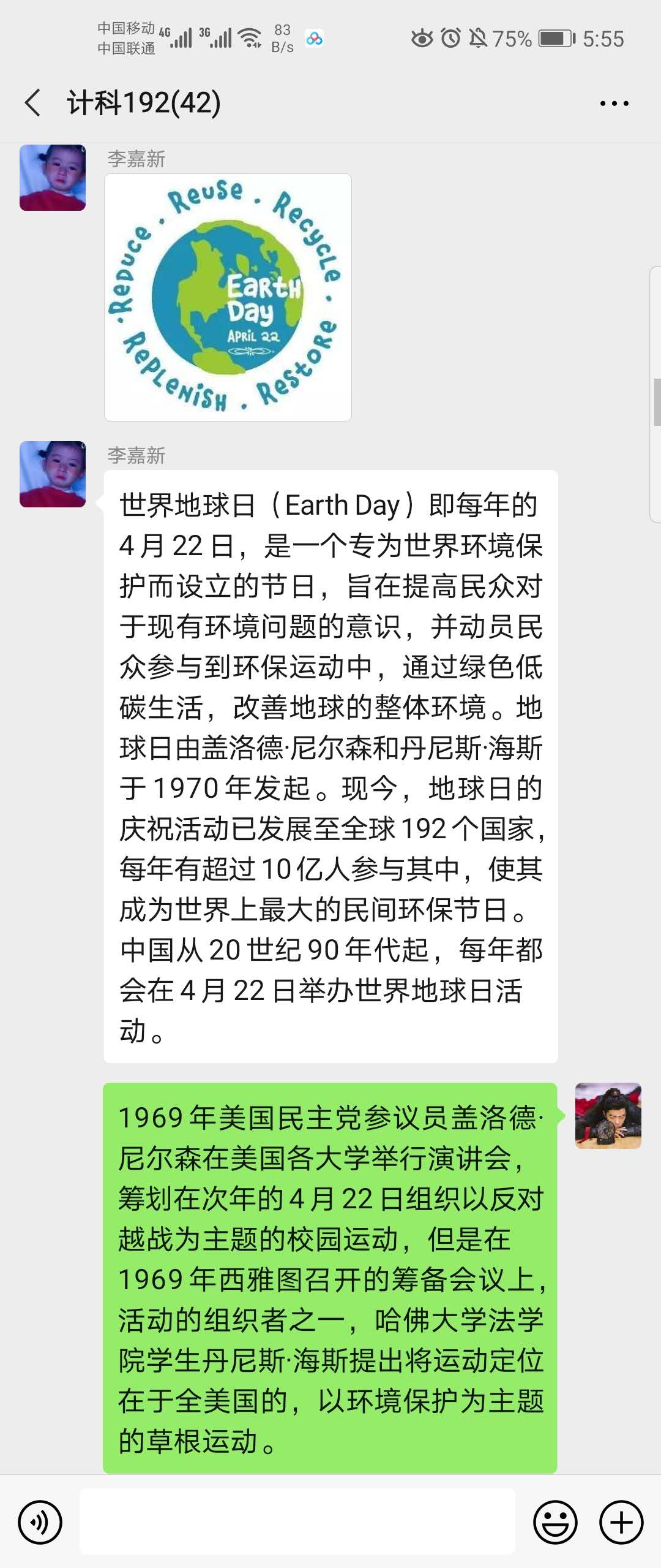 2020年4月22日,计科192班于微信平台开展“善待地球一从节约资源做起”主题团活,此次团活由组织委员李嘉新主持,计科192班全体同学共同参与。