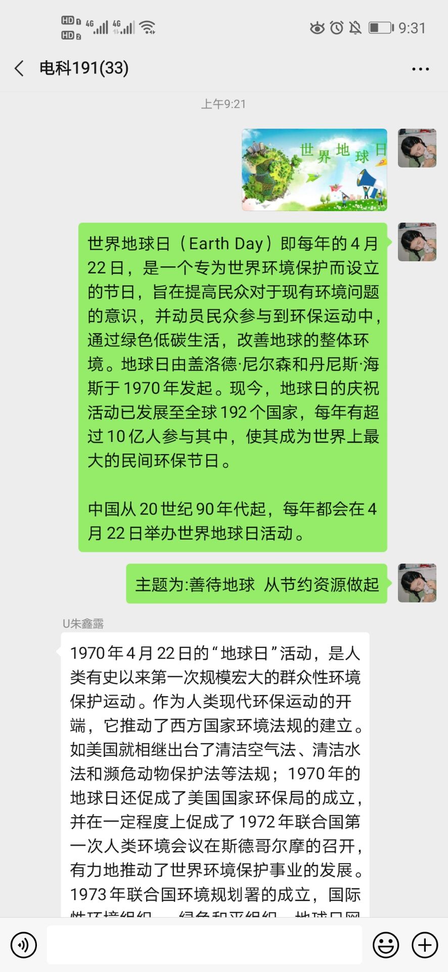 为提高同学们环境保护意识,倡导绿色低碳生活。电科191班于2020年4月22日在班级微信群里开展了世界地球日主题团活,本次会议由组织委员康佳慧主持,电科191班全体同学参加。
