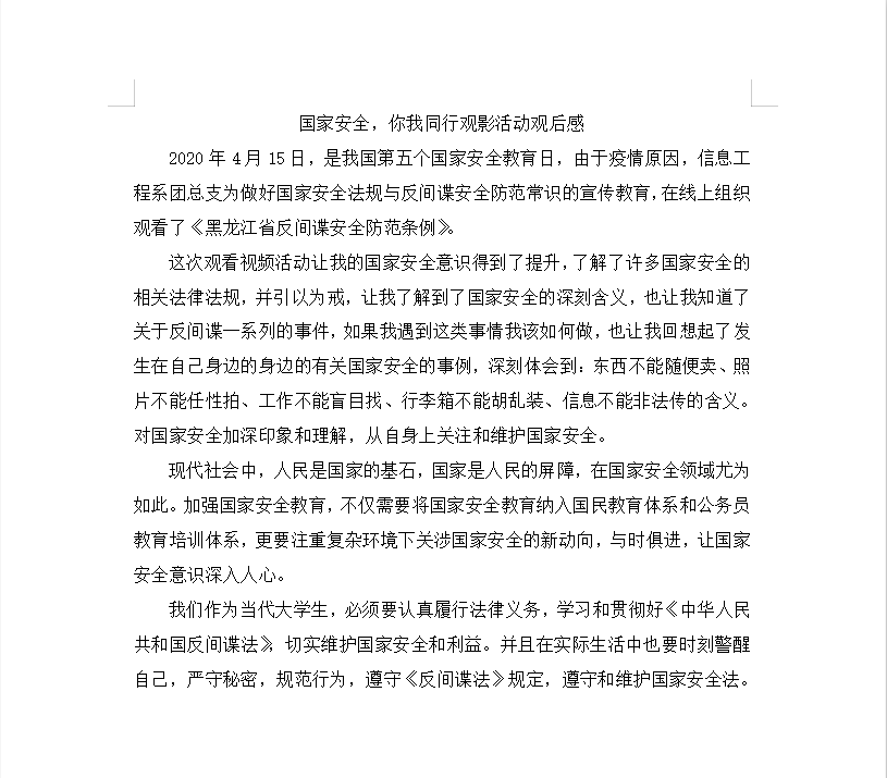 2020年4月15日,是我国第五个国家安全教育日,由于疫情原因,信息工程系团总支为做好疫情期间关于国家安全法规与反间谍安全防范常识的宣传教育,4月18日在线上组织观看了《黑龙江省反间谍安全防范条例》,并让同学们积极抒发自己的观后感。
