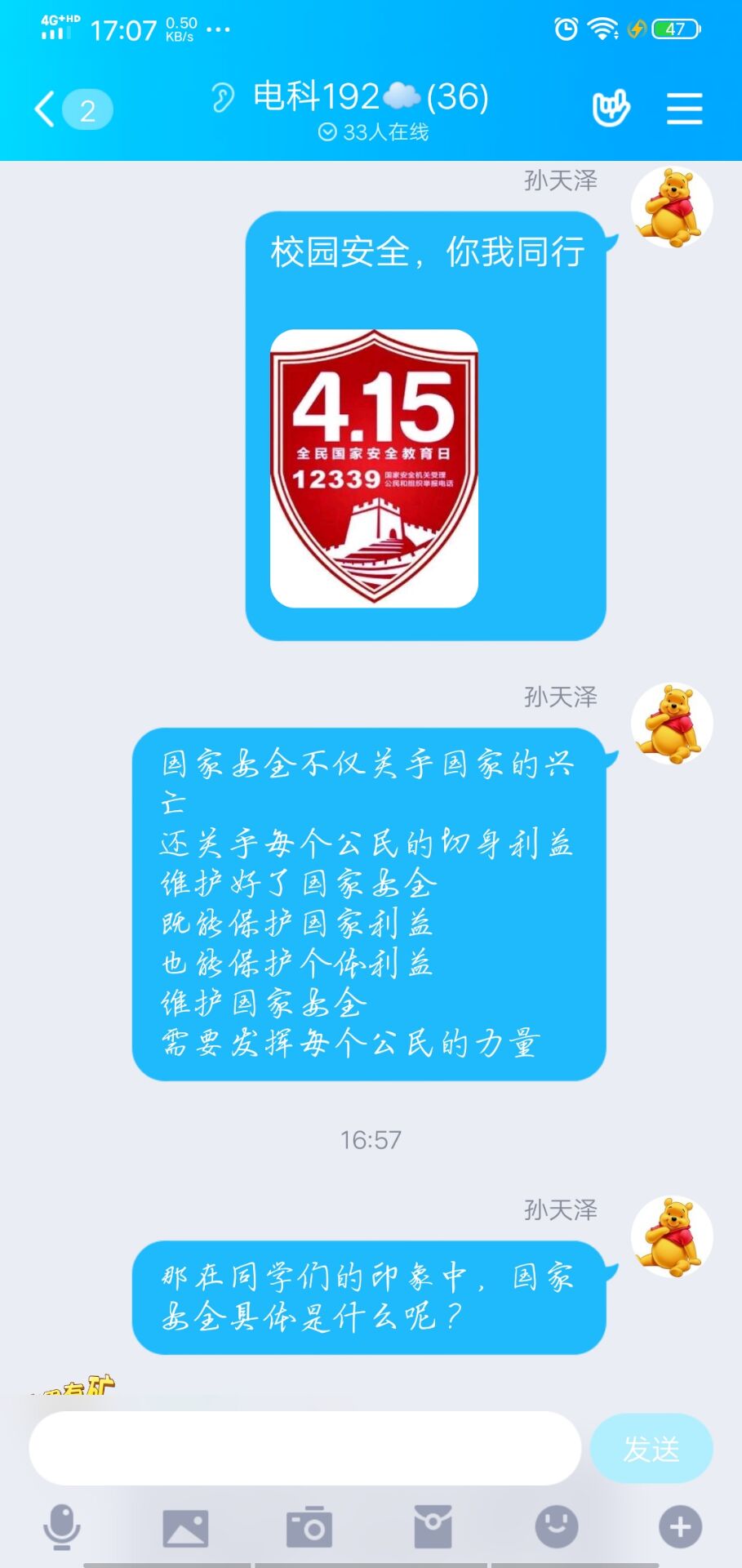 2020年4月15日电科192班开展了以“校园安全,你我同行”为主题的国家安全教育日团活,本次团活由组织委员孙天泽主持,电科192班全体同学参加。