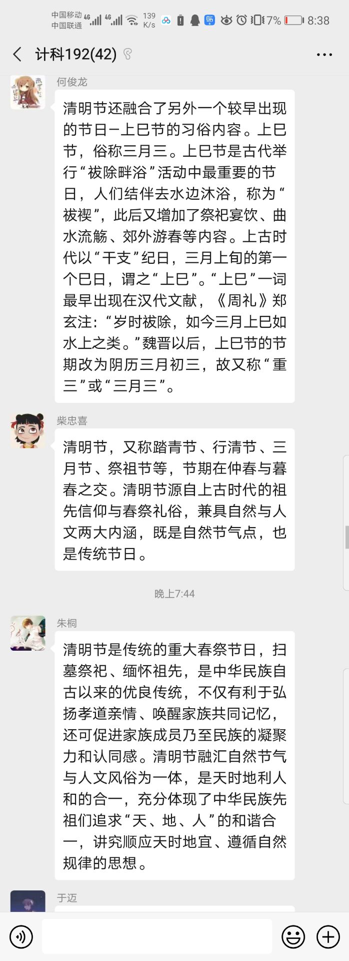活动一开始,首先由组织委员李嘉新向同学们做表率,简单解释清明节的由来。随后由同学们展开了有关清明节的讨论,每个人在微信平台上分享了自己所知的清明节的习俗。最后借清明节为契机,悼念革命先烈,缅怀先烈的丰功伟绩,同学们一起在群内分享了革命先烈的光荣事迹,向烈士表达自己的无限敬意和哀思,让同学们知道了当年革命先烈如何在艰苦的条件下与敌人艰苦战斗,知道今天的幸福生活来之不易。珍惜现在,珍惜当下,不忘初心。