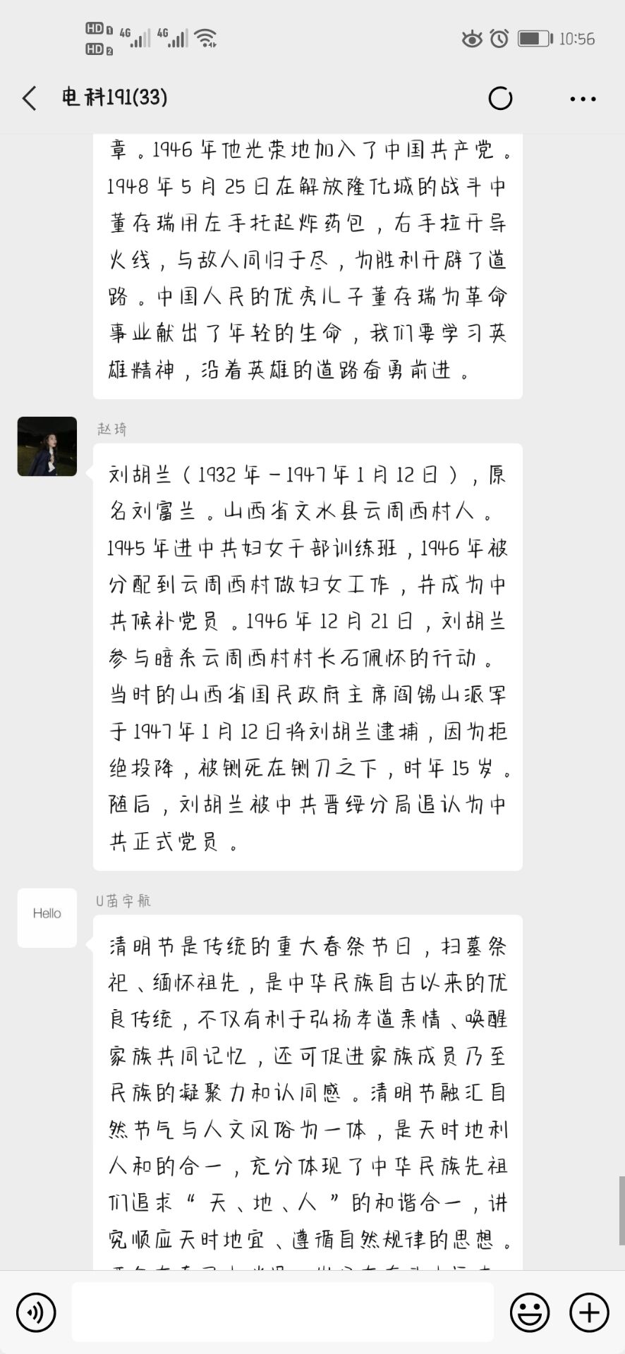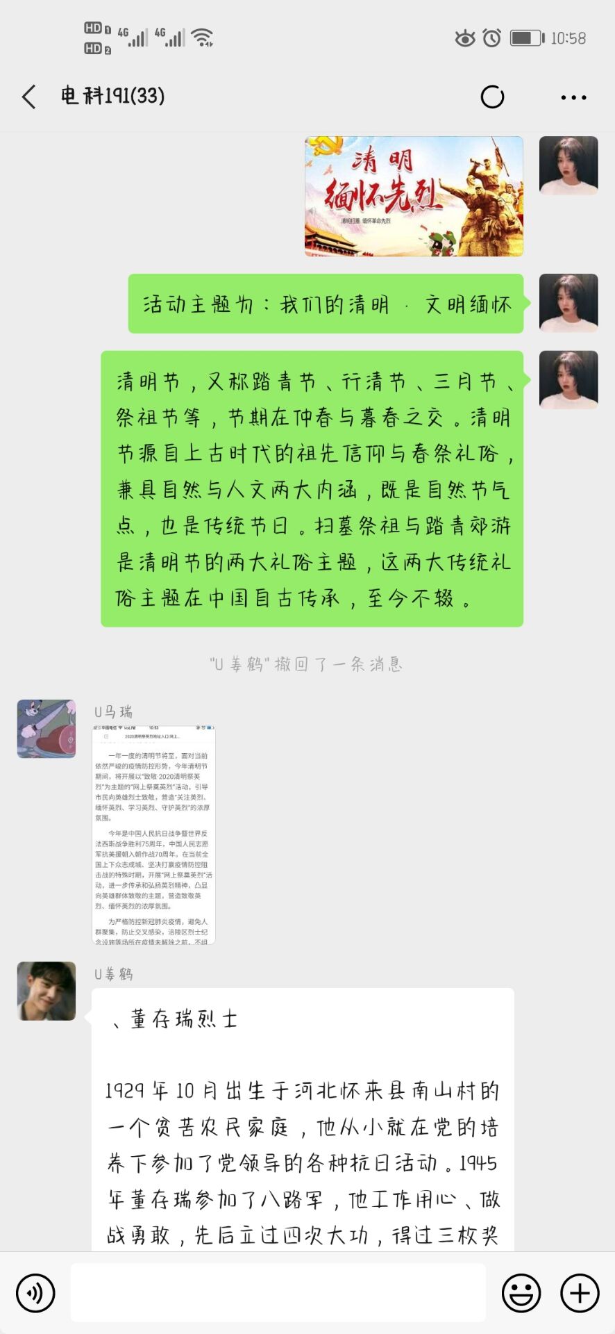 活动开始,组织委员康佳慧同学向发表了本次活动的主题,并且为大家简单介绍了清明节的习俗以及由来。其后,同学们开始在群内分享起了自己所知道的知识,有的同学介绍了自己家乡清明节的传统,有的同学介绍了清明节我们应当缅怀的先烈的事迹,大家也毫无保留,每个人都参与到了讨论之中。最后,在同学们的相互分享中,活动圆满结束。