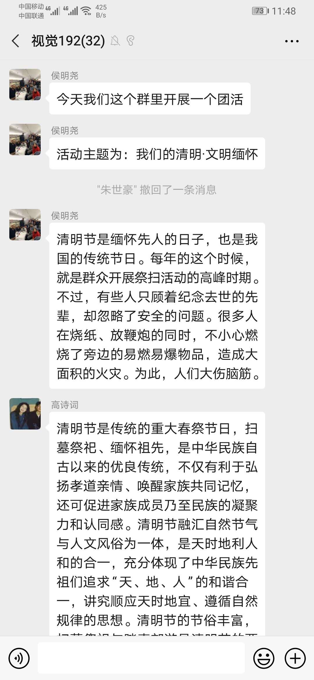 临近中国传统节日清明节,在疫情期间,我们仍然要继承中华民族节日清明节的传统,弘扬爱国主义。2020年4月2日,视觉192班每个人在消息讨论组里分享了自己在家是如何理解传统节日清明节。