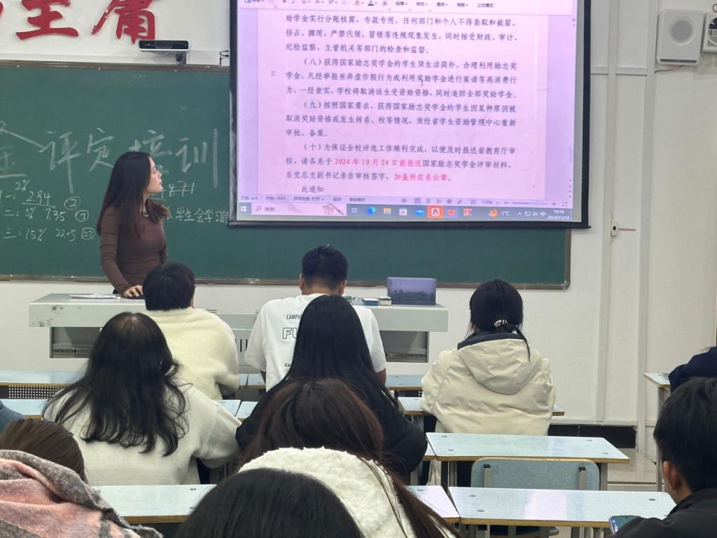 接着,就奖学金评定展开细致讲解,从学习成绩的核算方式、排名要求,到学业表现、品德行为表现和文体劳动表现三方面的综合素质考量细则,都一一清晰呈现,还重点强调了奖学金评定的时间。接着在贫困助学金方面,详细说明了家庭经济情况证明材料的规范格式以及班级评议环节的要点等,确保真正困难的同学能得到帮扶。然后对于国家励志奖学金,着重强调了既要达到学业成绩优秀标准,又要满足家庭经济困难这一必要条件的双重要求。最后,在培训期间,主持人还设置了问答环节,以确保每位同学都能对奖学金评定的相关内容有清晰明确的认识,现场形成了良好的学习交流氛围。