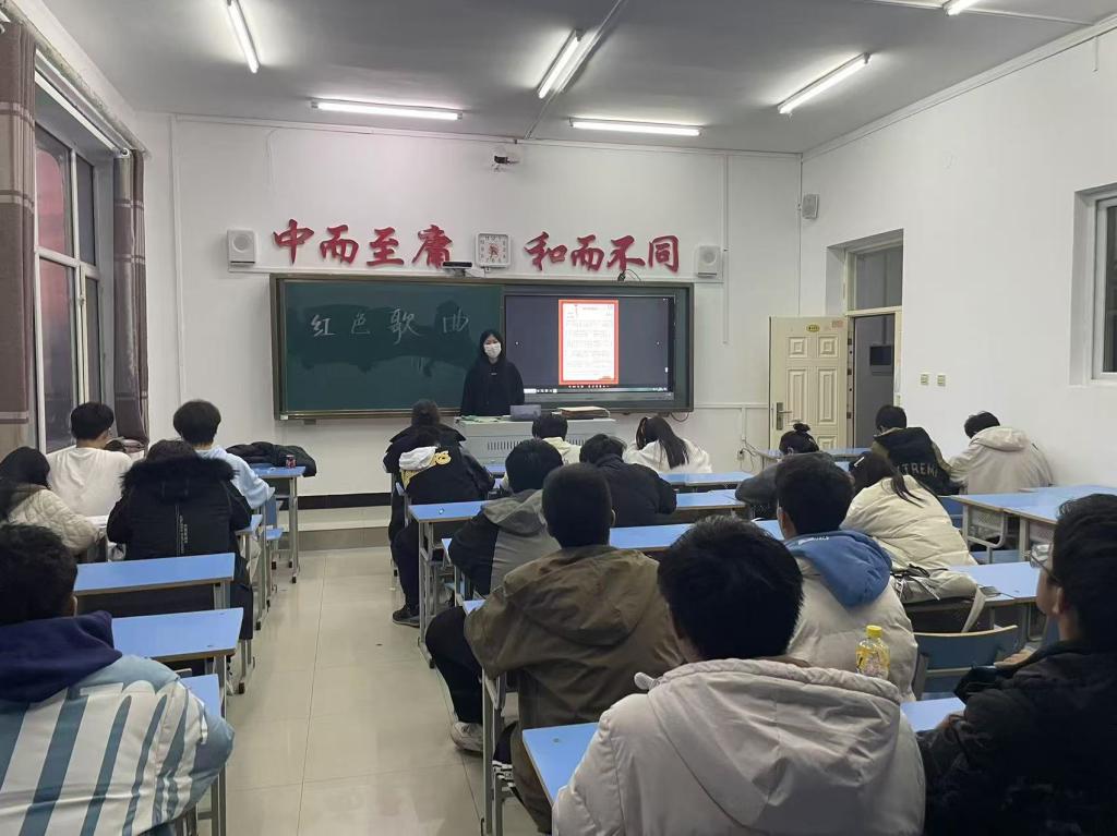 首先,安丽茹介绍红色歌曲的历史意义,它们诞生于革命年代,见证了中华民族的奋斗历程,承载着人民的爱国情怀和对美好生活的向往,开启本次活动。然后,同学们介绍了《义勇军进行曲》、《十送红军》、《保卫黄河》等红色歌曲,几位同学主动上台演唱《团结就是力量》,用嘹亮的歌声展现出团结奋进的力量。最后,安丽茹对此次活动做出总结,强调红色歌曲是中华民族的精神财富,希望同学们传承红歌精神,将爱国情怀融入到日常的学习和生活中。