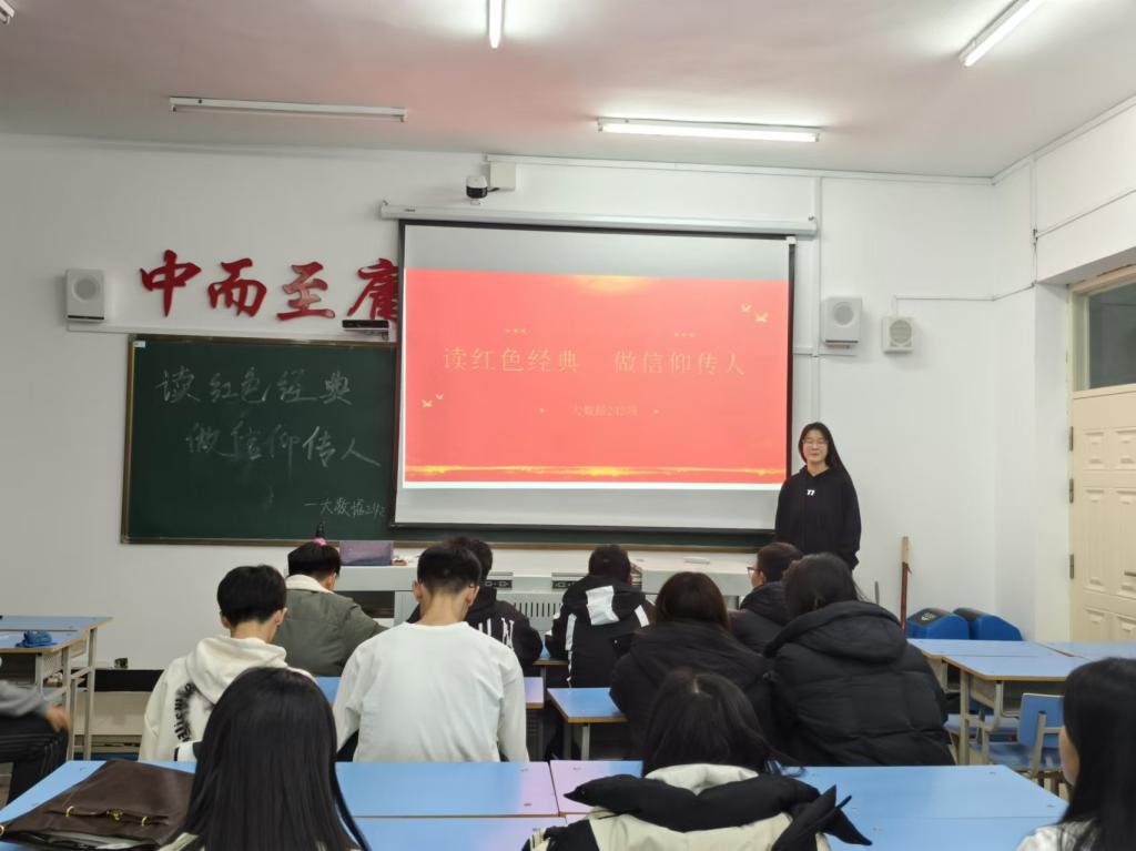 首先,同学们纷纷展示自己阅读红色经典的成果。有人分享《红岩》中华子良忍辱负重的故事,有人讲述《长征》中红军战士坚韧不拔的长征精神。然后,讨论环节,同学们围绕如何将红色经典中的信仰融入日常生活展开热烈讨论。有的同学提出要学习先辈们的吃苦精神,在学习中克服困难;有的表示要传承正义与勇敢,维护班级和校园的和谐。最后,团支书王菁遥鼓励同学们多读红色经典,从中汲取力量,将先辈们的信仰融入自身,成为有信仰、有担当的时代新人。