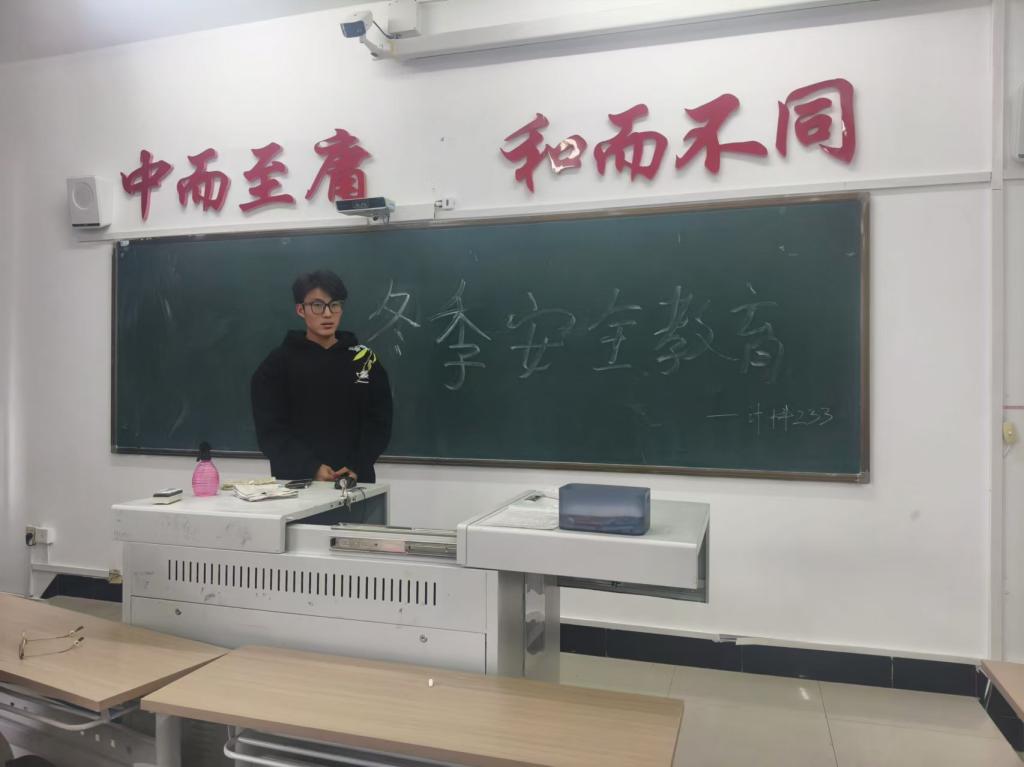 首先,班长武梦琳聚焦冬季大学生活中的安全问题。交通安全方面,提醒学生在湿滑道路上小心慢行,注意车辆。在宿舍安全部分,强调严禁使用违规大功率电器,避免因电路过载引发火灾。同时,针对冬季运动安全,告知大家做好热身,防止受伤。