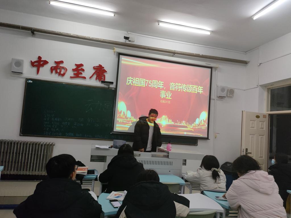 11月19日晚上,动画241班在一教A区1415教室开展以“庆祖国75周年,音符传颂百年事业”主题话动。本次主题活动由组织委员杨金羽主持。动画241班共36人参加。