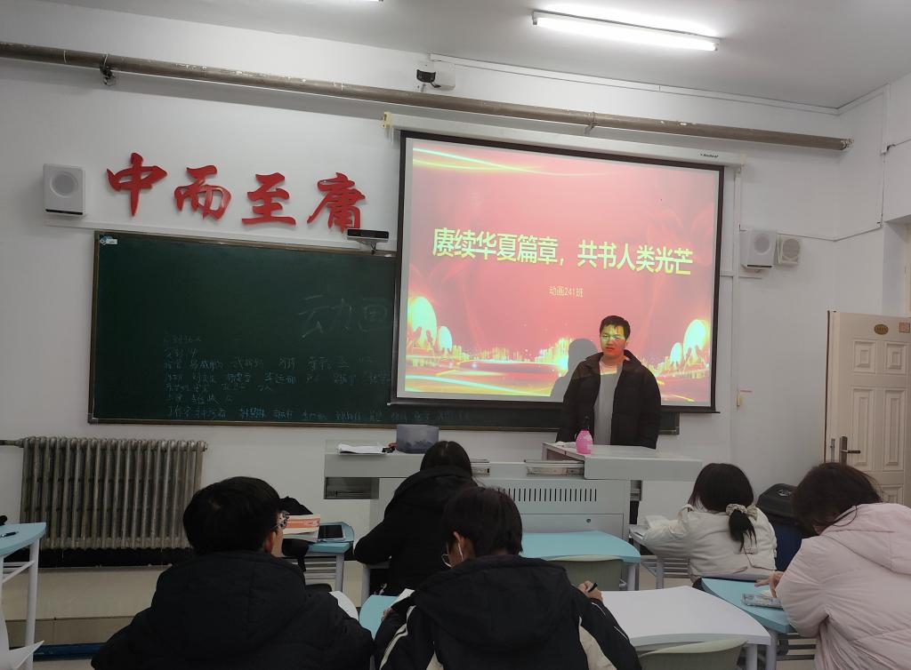 11月19日上午,动画241班在一教A区1415教室开展以“赓续华夏篇章,共书人类光芒”主题话动。本次主题活动由组织委员杨金羽主持。动画241班共36人参加。