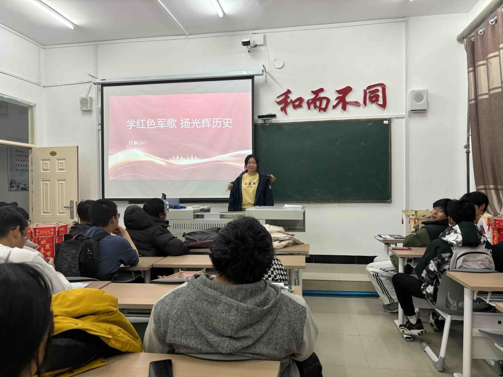 11月15日下午,计科241班在一号教学楼1402开展“学红色军歌,扬光辉历史”活动,此次活动由魏琳琳主持,计科241班全员参加。