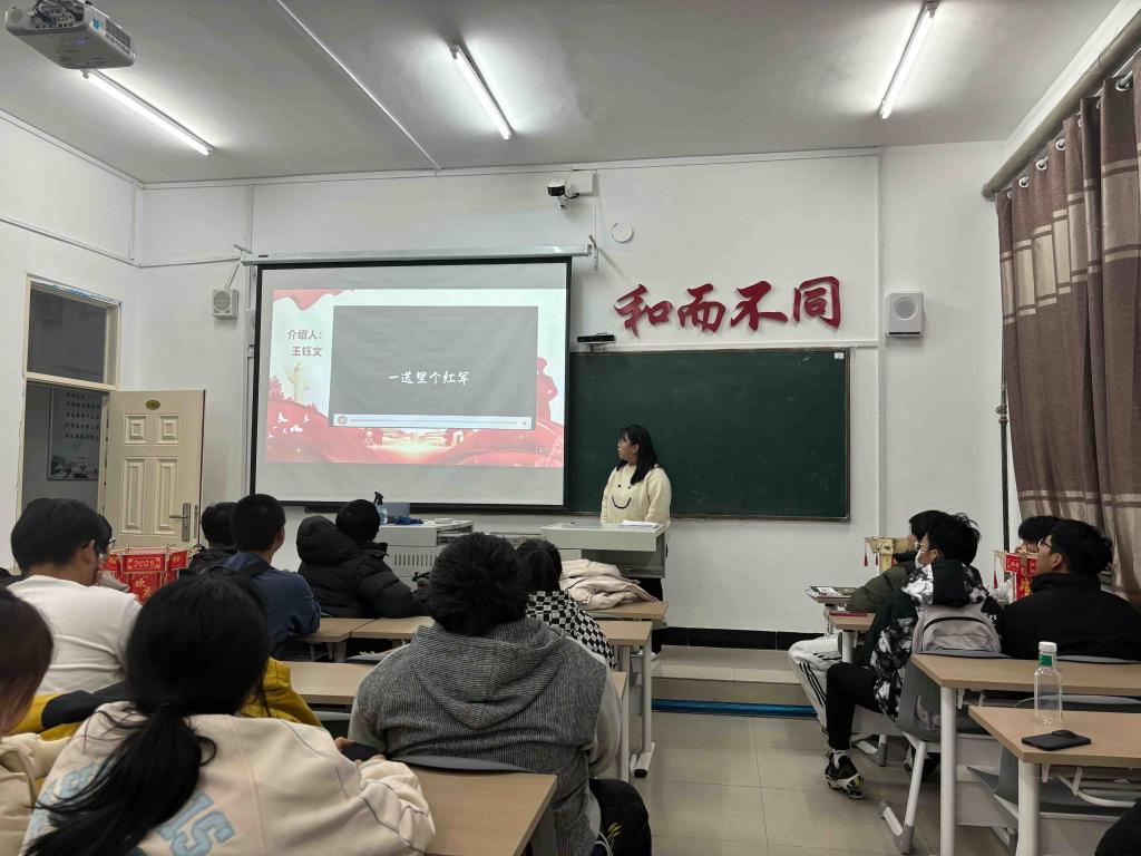 首先,王钰文同学介绍了本次活动的主题和目的,强调了历史影像作为历史的记录的重大作用,承载了无数历史时刻和前辈们的英勇事迹。其次,王钰文同学为同学们播放了一段红色视频,同学们观看认真,从红军战士们不畏艰险、爬雪山过草地的震撼场景到新时代建设者尽心尽力为中华民族伟大复兴而奋斗,展现出坚定的革命信念和顽强的意志。最后,王钰文同学对此次活动做出总结,这些红色视频不仅展现了革命先辈们的英勇无畏和无私奉献,也传递出了强烈的红色基因。同学们激发了强烈的红色基因。
