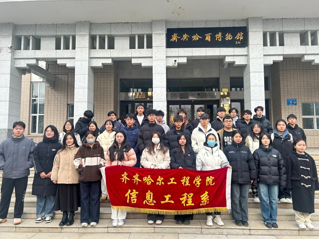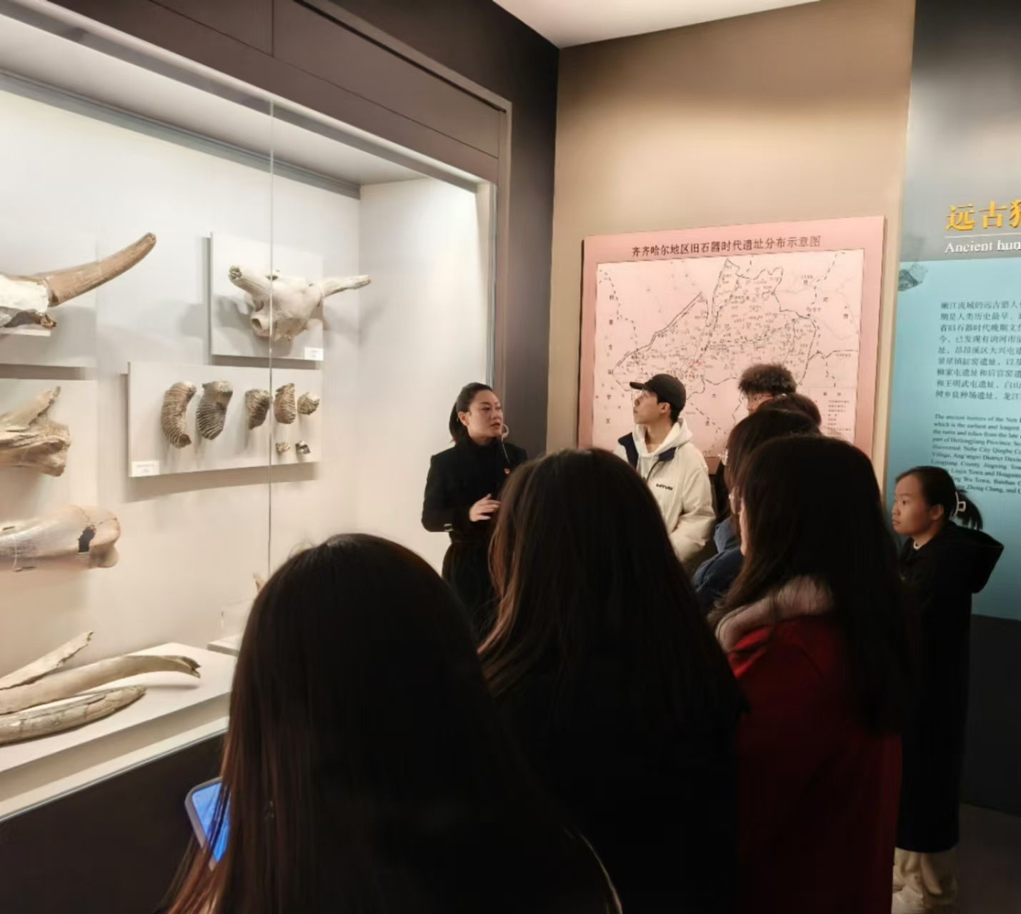 首先,组织部部长郑智柏带领同学们有序到达博物馆,步入其中,在讲解员的细致解说下,同学们首先步入了历史文物展厅,一件件珍贵文物,如石器、陶器、青铜器等,仿佛在默默诉说着往昔岁月的故事,让同学们深切感受到这片土地深厚的历史底蕴。随后,同学们来到了民俗文化展区,各种传统服饰、民间手工艺品以及反映当地民俗风情的场景复原,生动展现了齐齐哈尔独特的民俗文化魅力。同学们饶有兴趣地驻足观看,对齐齐哈尔的传统文化有了更直观、更深入的认识,在参观过程中,同学们认真记录、积极提问,与讲解员形成了良好的互动交流氛围。最后,同学们在博物馆大厅和这座充满厚重历史文化的建筑留下了合影,以此记录这次难忘的经历。