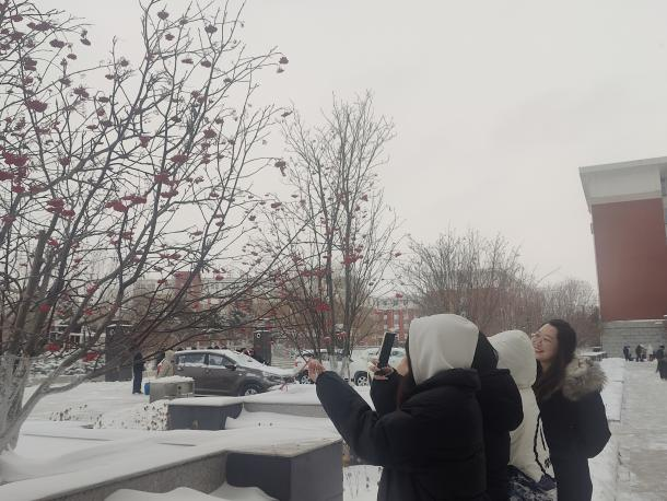 金子涵老师充分发挥其专业指导能力,在拍摄前为生涯学生们详细讲解了拍摄技巧与创意构思。从如何选取最佳拍摄角度以展现雪后校园建筑的壮丽轮廓,到巧妙利用光线营造出雪的晶莹质感。在拍摄过程中,金子涵老师不断巡视各个学生,及时给予技术支持和创意建议。当发现某个小组在拍摄一处雪景时构图不够完美,老师便亲自示范,调整拍摄位置和角度,瞬间让画面有了质的提升。同时,金子涵老师鼓励学生们大胆创新,不要局限于传统的拍摄手法。在金子涵老师的鼓励下,学生们尝试运用慢门拍摄,让飞舞的雪花呈现出梦幻般的轨迹;利用全景拍摄展现出校园雪景的宏大与壮观。