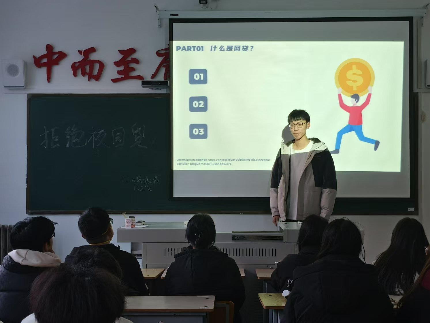 首先,纪检委员王淳通过一系列真实且触目惊心的校园贷案例,直观地展示了校园贷的危害。然后,从高额利息导致的债务雪球越滚越大,到暴力催收给学生及其家庭带来的身心创伤,让同学们深刻认识到看似便捷的校园贷背后隐藏的巨大陷阱。最后,在讨论环节,同学们积极发言,分享自己对校园贷的看法和身边潜在的风险事例,并共同探讨应对方法。
