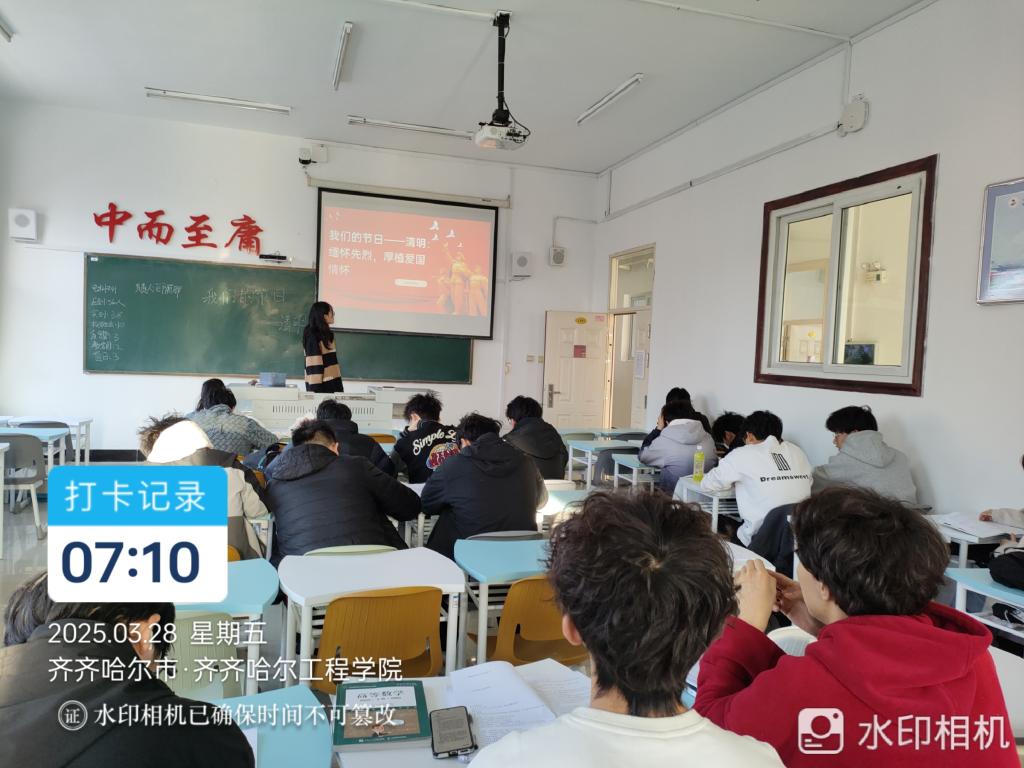 本次会议旨在引导学生铭记历史,传承和弘扬中华优秀传统文化。首先,徐雯萱同学借助精心制作的PPT、生动的视频资料,向同学们讲述清明节的由来、习俗。从介子推与寒食节的传说,到清明踏青、扫墓等传统习俗,同学们听得津津有味,对清明节有了更为深刻的认识。随后,为了让同学们铭记革命先辈的英勇事迹,徐雯萱同学讲述了众多英烈的感人故事,让学生们真切感受到革命先烈们为了国家和人民,不惜牺牲一切的崇高精神。不少同学被深深打动,眼眶泛红,纷纷发言表达对先烈的敬意和缅怀之情。最后,,徐雯萱同学了组织知识问答,同学们踊跃抢答,课堂气氛十分活跃,不仅巩固了知识,更激发了对传统文化的探索热情。