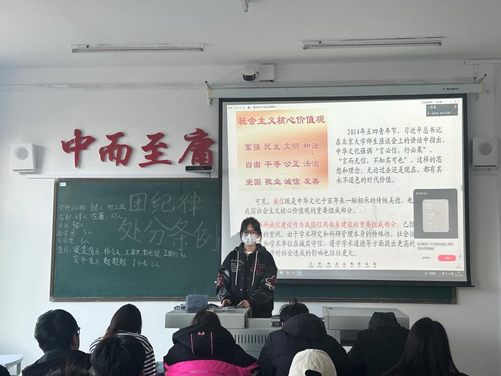 班会伊始,团支书李红壮向同学们阐述了学习《团纪律处分条例》的重要意义,强调团的纪律是维护团组织团结统一、完成党赋予职责使命的重要保证,作为新时代的共青团员,必须时刻牢记自身使命,严格遵守团的纪律。