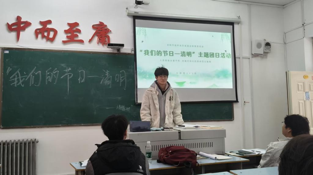 首先,团支书张宝怡播放一段生动的视频,让同学们走进了清明节的世界。视频中,祭扫、踏青等场景让同学们对清明节有了直观的认识深入了解了清明节的起源、发展历程以及丰富的传统习俗,讲述了寒食节与清明节的历史渊源。其次在缅怀革命先烈环节,团支书张宝怡讲述了刘胡兰、董存瑞等革命先烈的英勇事迹。讲述结束后,同学们围绕“如何传承革命先烈精神”展开了激烈的小组讨论,各小组代表纷纷发言,表达了要珍惜当下、努力学习、报效祖国的决心。最后为增添活动的趣味性,班会特别设置了互动环节。在清明诗词接龙和知识问答竞赛中,同学们踊跃抢答,展现出丰富的知识储备。一道道有趣的题目,不仅加深了同学们对清明节的认识,还让大家在轻松愉快的氛围中收获了知识,赢得了小奖品。团支书张宝怡对本次活动进行了总结,强调清明节既是对先辈的追思,也是传承传统文化的重要契机。鼓励同学们在今后的生活中,将革命先烈的精神转化为学习的动力,为实现中华民族伟大复兴贡献自己的力量。
