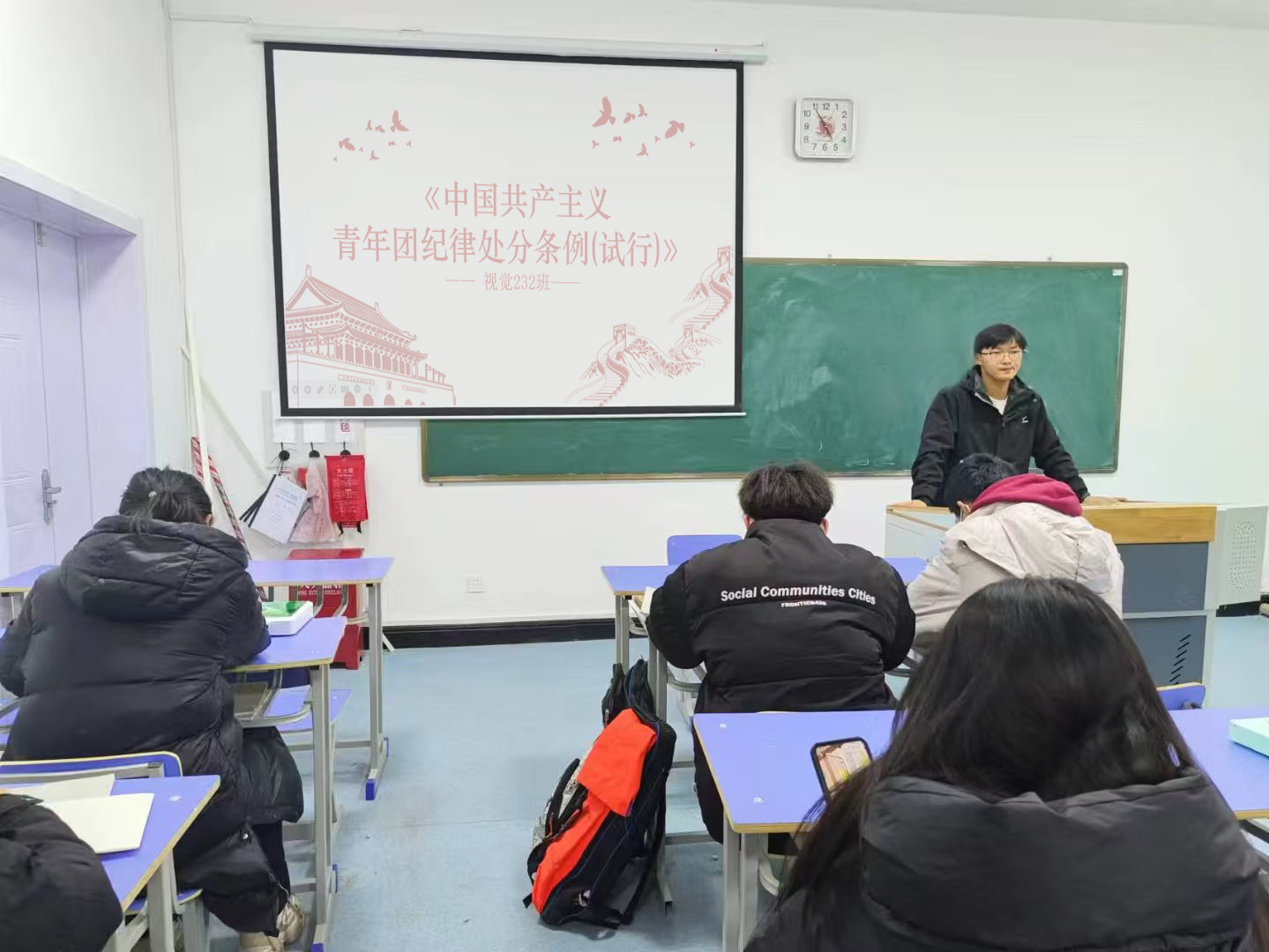 3月28日晚上,视觉232班于三号教学楼1106教室召开学习《中国共产主义青年团纪律处分条例(试行)》主题班会。此次班会由视觉232班团支书李太赟主持,共28人参加。