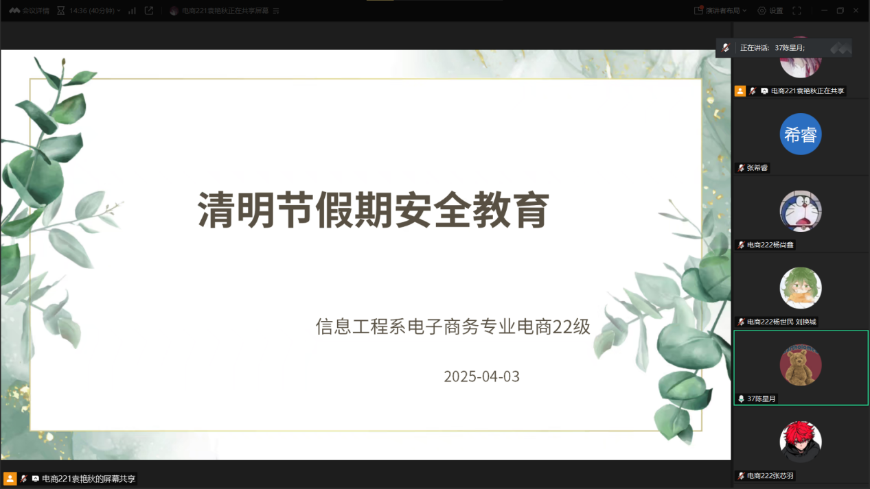 为增强学生假期安全意识,筑牢安全防线,电子商务22级于4月3日下午在线上平台召开“清明节假期安全教育”线上主题班会。本次会议由辅导员老师陈星月主持,电子商务专业22级全体同学参加。