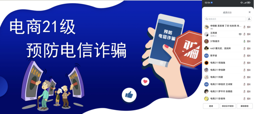 5月28日下午,电商21级在腾讯会议平台召开预防电信诈骗主题班会。本次会议由辅导员陈星月主持,电商21级全体同学参与会议,共同筑牢反诈“防火墙”。