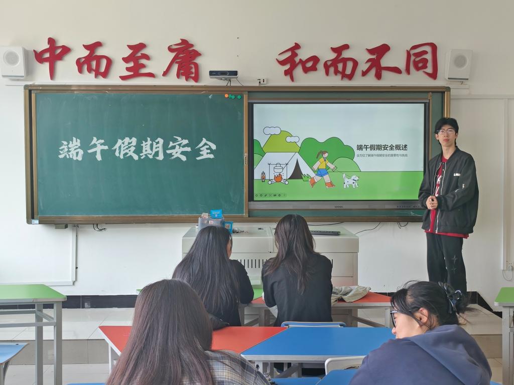 首先,何家兴针对出行安全展开重点讲解。提醒同学们,若选择乘坐公共交通出行,要通过正规渠道购票,避免乘坐黑车。自驾出行的同学,务必提前检查车辆状况,严格遵守交通法规。接着,在消防安全方面,何家兴结合端午期间可能会进行的户外活动,告诫大家在野外不可随意生火,离开住所时要关闭电源、火源,防止火灾发生。然后,在食品安全层面,何家兴指出端午期间购买粽子等食品要选择正规商家,注意查看保质期。同时,不要食用来源不明的食物,以防食物中毒。网络安全也不容忽视,警示同学们假期上网时,不轻易点击陌生链接,不随意透露个人信息,防范网络诈骗。