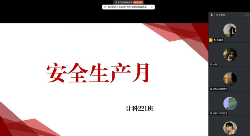 6月7日上午,计科221班在线上腾讯会议组织开展“安全生产”主题教育活动,通过专题微课堂、案例视频学习等环节,全面提升班级同学的安全意识与职业素养。活动由团支书李馨雨主持,计科221班共456人参与。
