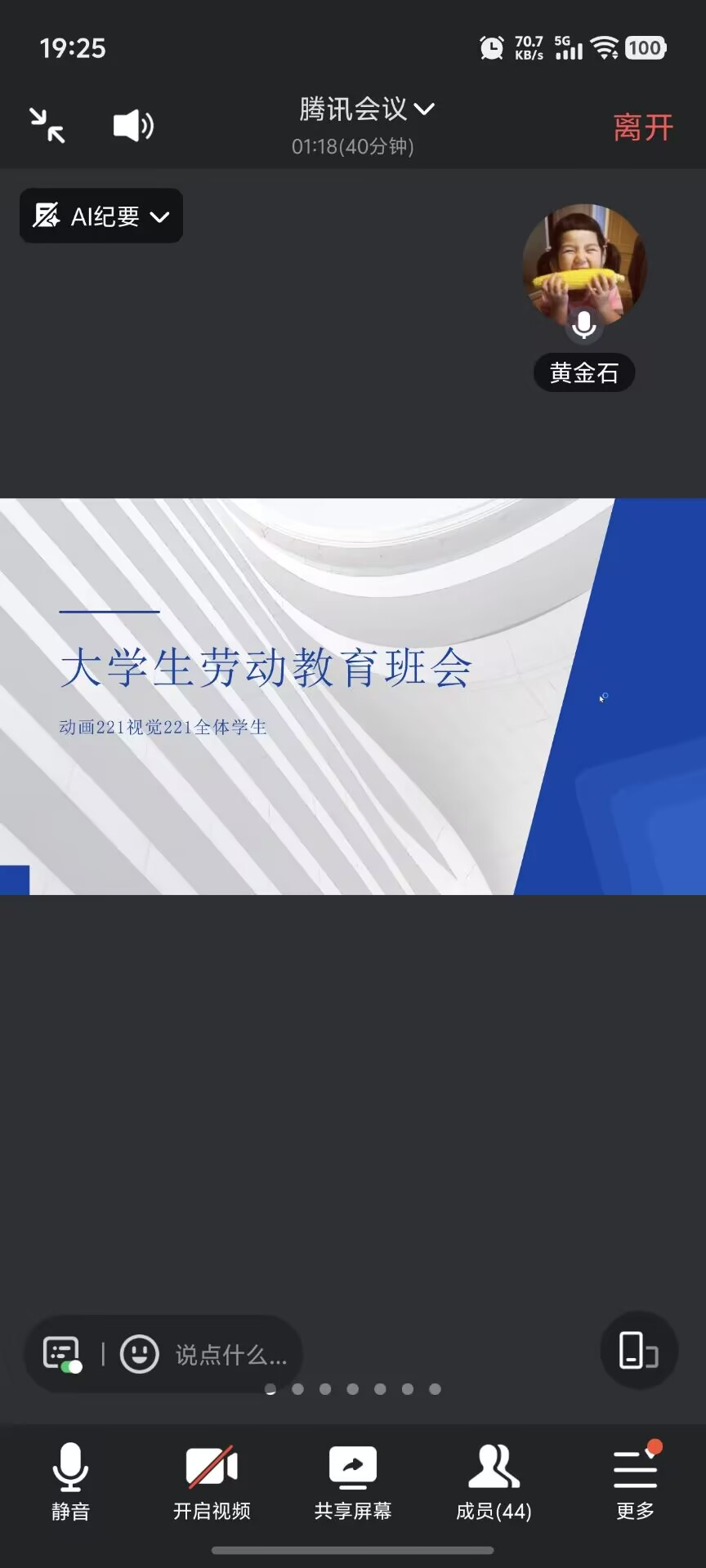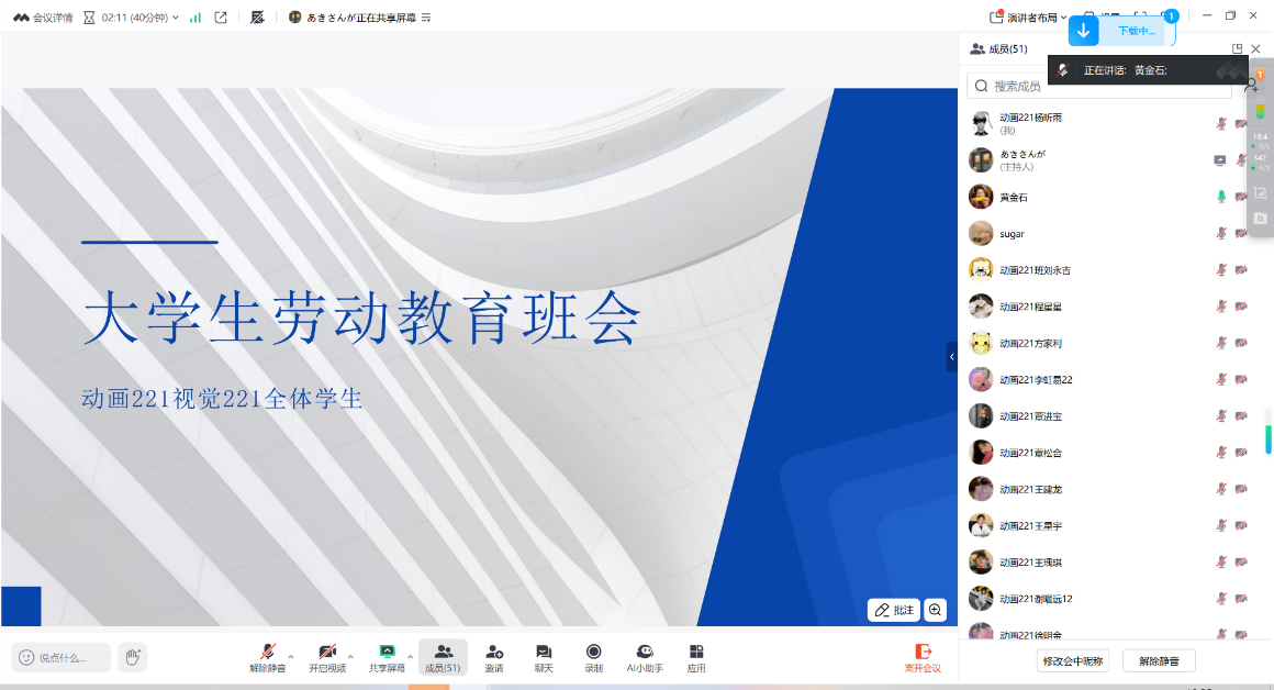 8月2日,动画221班在线上腾讯会议开展“劳动教育主题”班会,由辅导员黄金石主持,动画221班共34余人参加。此次班会的目的是让同学们深刻认识劳动的价值与意义,培养热爱劳动的品质,将劳动精神融入学习和生活。