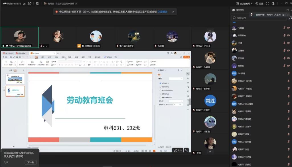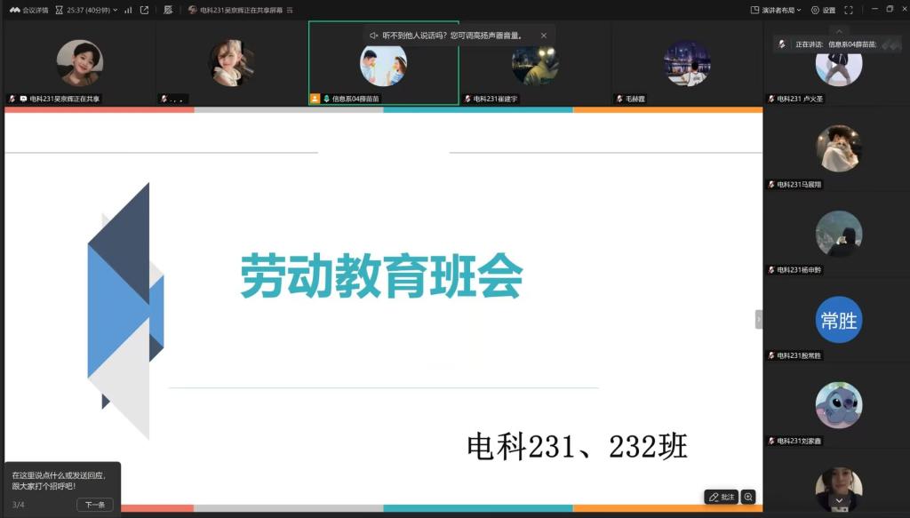 7月25日下午,电科23级利用腾讯会议展开“劳动教育”主题班会。此次班会由辅导员薛苗苗主持,电科23级共有60人参加。
