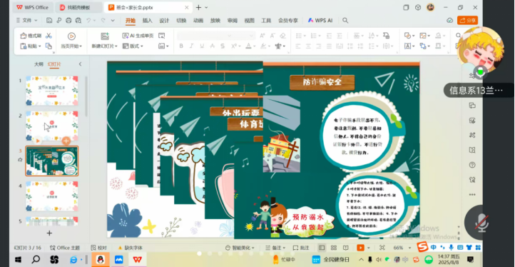 8月8日下午,大数据221班与大数据222班全体同学通过线上平台参与由辅导员兰天月老师主持的专题会议。会议围绕暑期安全防护、诈骗防范、开学补考安排及学位授予要求等核心内容展开,为同学们筑牢安全防线、明确学业方向。