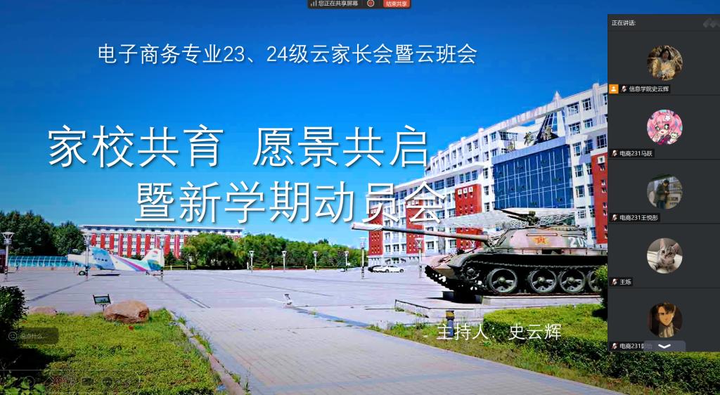 为加强家校沟通,助力学生更好地开启新学期大学生活,电子商务23级与24级于8月28日晚6点召开线上云家长会。本次会议由辅导员史云辉主持,专业负责人徐一楠、23、24级全体家长共同参与。