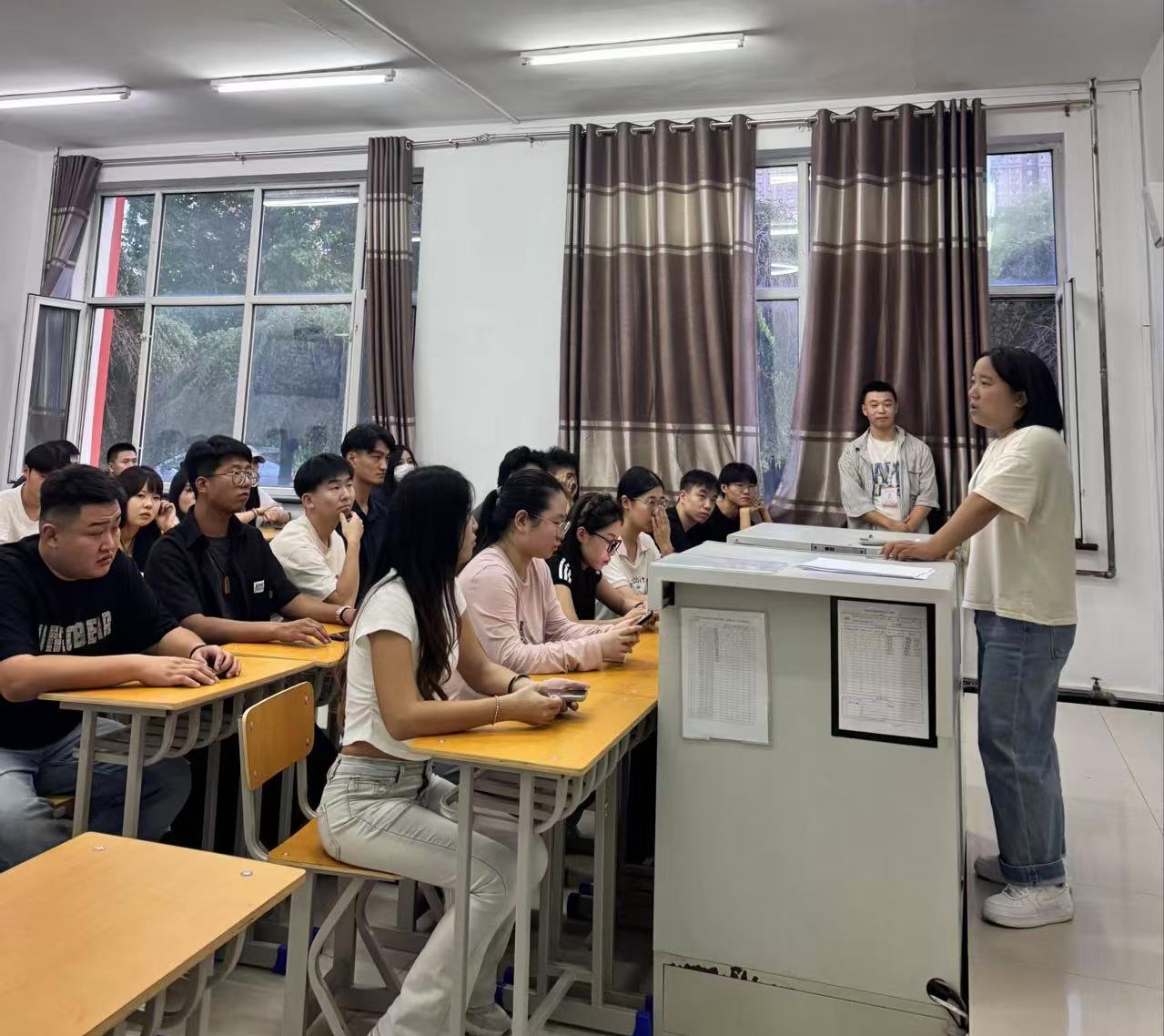 随后,辅导员刘阳也进行了自我介绍,随后围绕校园生活安全与日常管理展开,从宿舍用电规范、网络安全防范,到校园活动参与途径,用贴近生活的案例和建议,让新生感受到贴心指引。